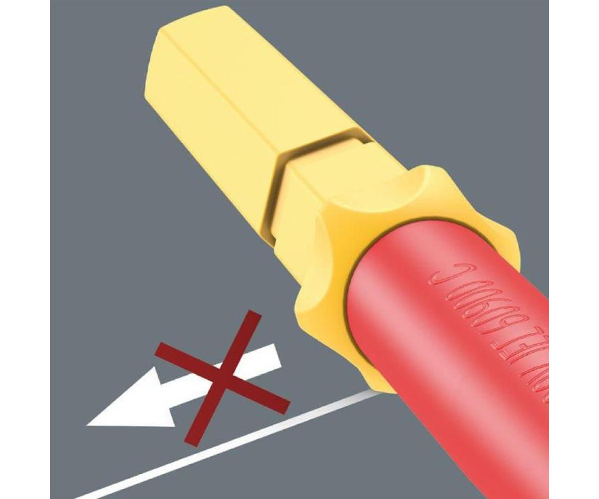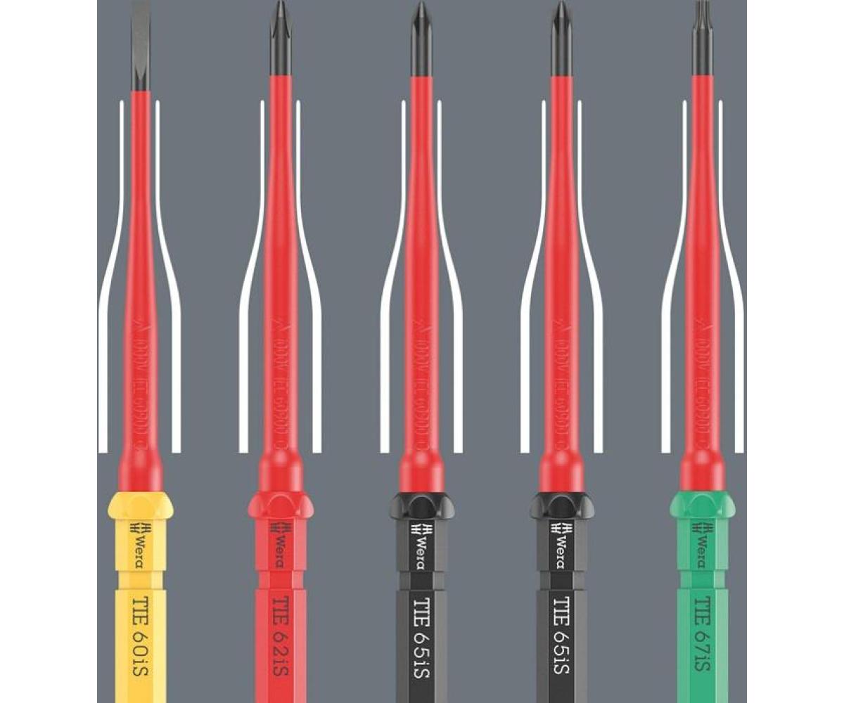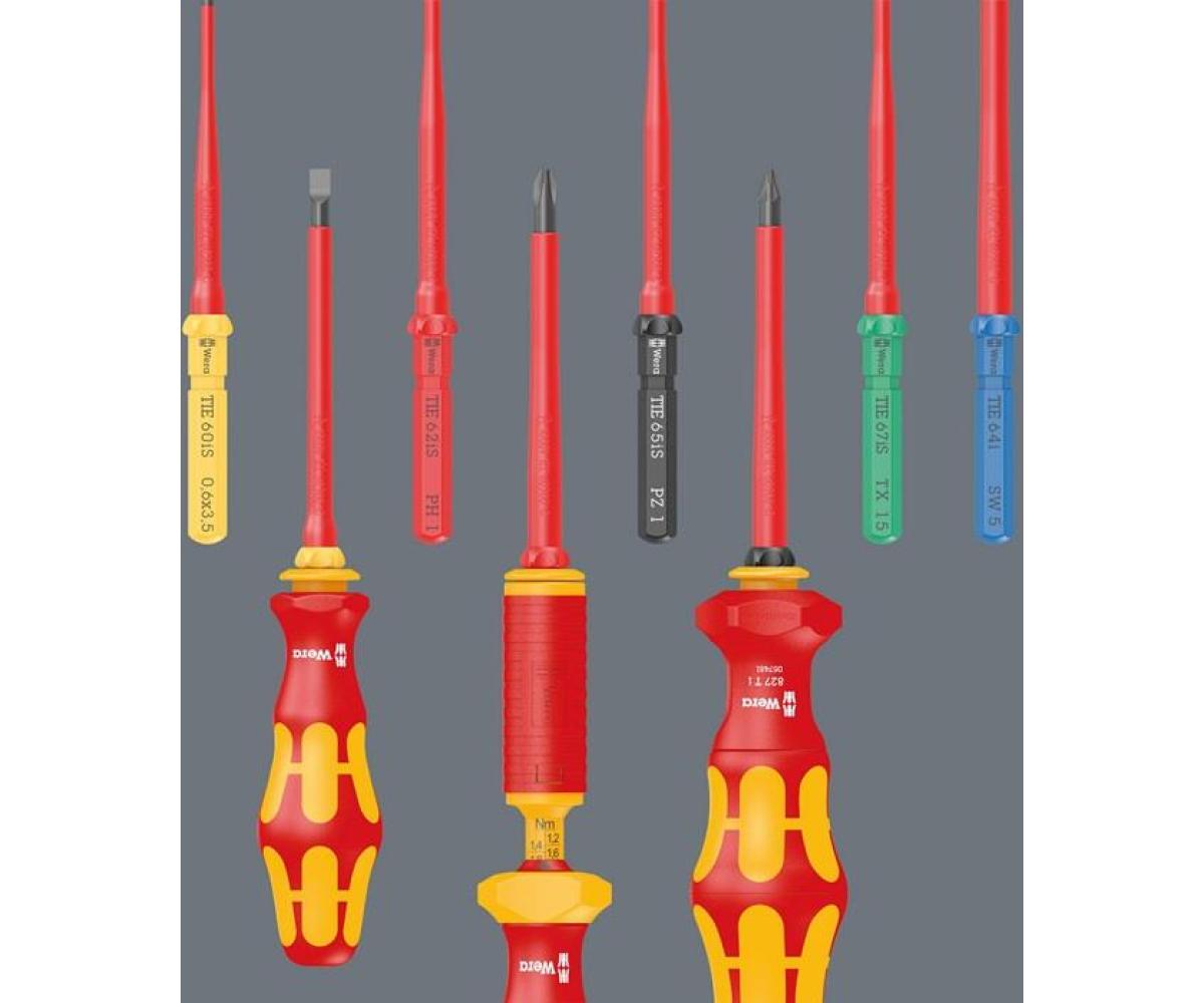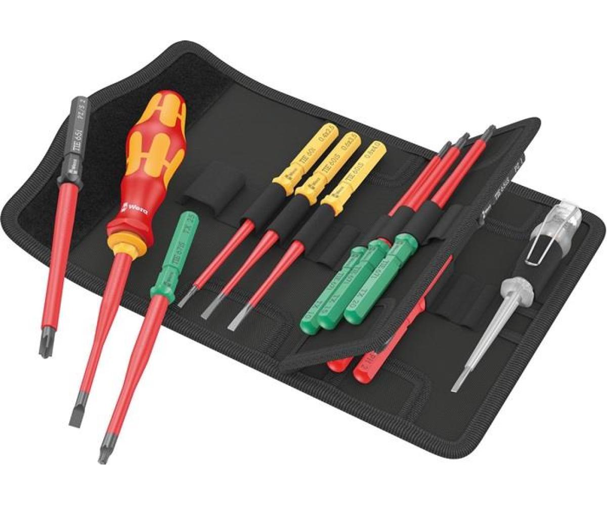 mit 14 VDE-Wechselklingen und Handhalter 817 VDE Kraftform (Quergriffform) und Werkzeugfinder "Take it easy" · mit reduziertem Klingendurchmesser mit integrierter Schutzisolation · IEC 60900 (Stückprüfung bei 10.000 V) · für sicheres Arbeiten bei der zugelassenen Spannung von 1.000 V · mit einpoligem Phasentester · in robuster Textil-Gürteltasche