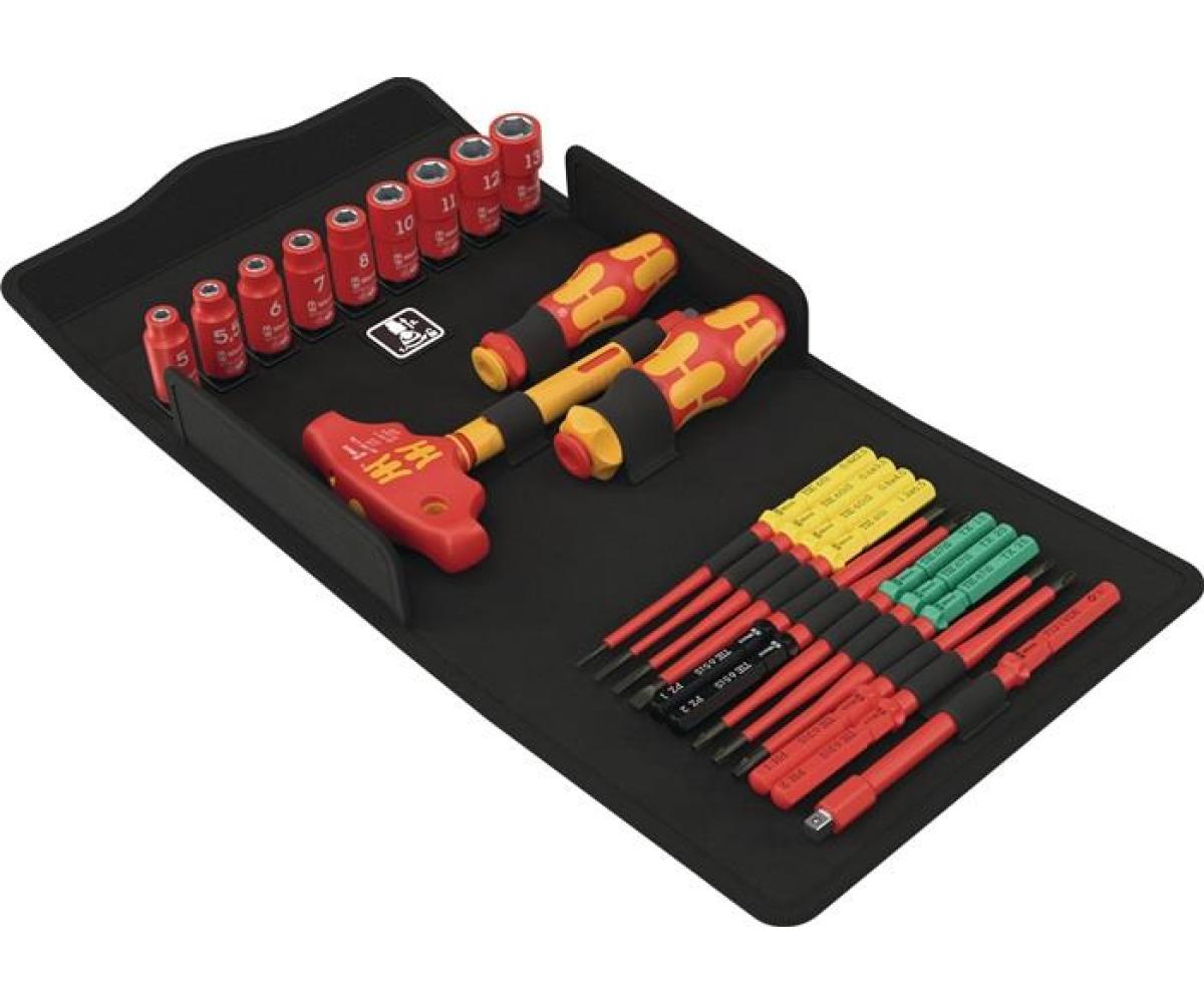 25-teilig · Allround-Set für sicheres Arbeiten unter Spannung – ideal für Elektro-Profis · alle Werkzeuge stückgeprüft nach IEC 60900 bei 10.000 V – für sicheres Arbeiten bis 1.000 V · 2 Handhalter: - 837 i RA mit Ratschenfunktion (40 Zähne, 9° Rückholwinkel), - 817 VDE – beide für VDE-Wechselklingen geeignet · Quergriff-Ratschenschraubendreher (410 i VDE A RA) für 1/4"-Steckschlüsseleinsätze und Bitnüsse · Adapterklinge (Kraftform Kompakt A VDE 712 i) – adaptiert von 1/4" Außensechskant auf 9 mm Außensechskant · 11 VDE-Wechselklingen (157 mm) mit Zwirbelfunktion, Abrollschutz und „Take it easy“-Werkzeugfinder (Farbcode + Größenlaserung) · 9 Zyklop-Steckschlüsseleinsätze mit 2-Komponenten-Isolation: gelber Sicherheitskern unter roter Isolierung – bei Beschädigung sofort sichtbar · platzsparend in robuster Textilbox, andockbar an Wera 2go oder per Klett an Werkstattwagen/Wand befestigbar