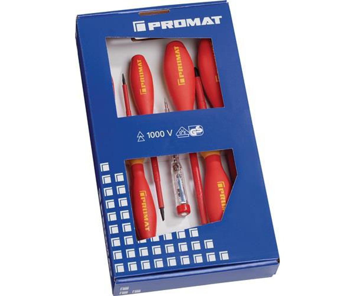 Inhalt: je 1 Schraubendreher für Schlitzschrauben 3,0 x 100 / 4,0 x 100 / 5,5 x 125 / 6,5 x 150 mm je 1 Schraubendreher für Schrauben mit Kreuzschlitz (PH) Gr. 1 x 80 / 2 x 100 mm 1 Spannungsprüfer 3,0 x 65 mm