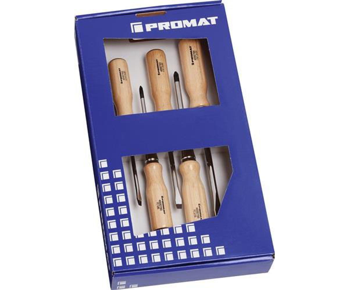 Weitere technische Eigenschaften · Verpackung: im Karton · Schraubendrehersatz · 5-tlg.Schlitz/PZD · Holzgriff Rundklinge · Inhalt: je 1 Schraubendreher für Schlitzschrauben, 4,5 x 90 / 5,5 x 100 / 7,0 x 125 mm je 1 Schraubendreher für Schrauben mit Kreuzschlitz (Ausführung siehe Tabelle) Gr. 1 x 80 / 2 x 100 mm ·