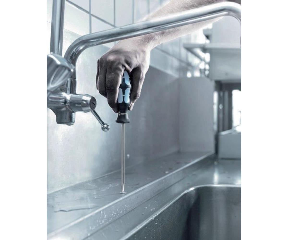 Hochwertiger Kraftform Plus Schraubendreher aus Edelstahl. Die Edelstahlwerkzeuge von Wera sind vakuumeisgehärtet und verfügen damit über die für Verschraubungen benötigten Härten und Festigkeitswerte. Der industrielle Einsatz ist ohne Einschränkungen möglich. Die Lasertip-Spitze krallt sich im Schraubenkopf fest und verhindert das Herausrutschen aus dem Schraubenkopf. Mehrkomponentiger Kraftform Griff für schnelles und schonendes Arbeiten. "Take it easy" Werkzeugfinder mit Farbkennzeichnung nach Profilen und Größenstempelung - zum einfachen und schnellen Finden des benötigten Werkzeugs. Der Sechskantabrollschutz verhindert lästiges Wegrollen am Arbeitsplatz.