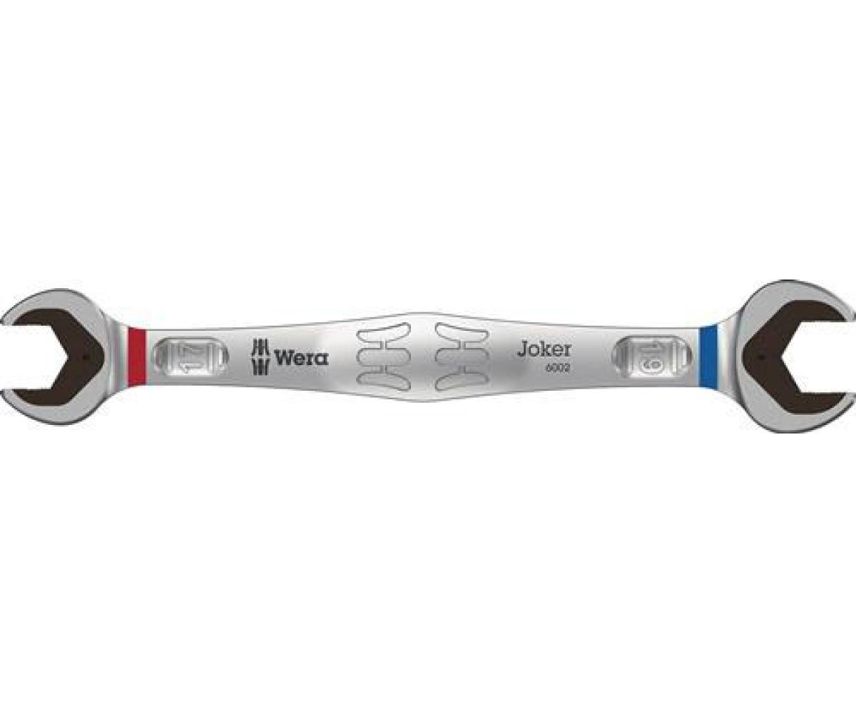 Weitere technische Eigenschaften · Oberfläche: matt verchromt · Material: legierter Werkzeugstahl · Doppelmaulschlüssel 6002 · Joker 17x19mm L.235mm ma · verchr.WERA · Sein Plus - Haltefunktion für Muttern durch eine Metallplatte im Maul - kein Abrutschen durch Endanschlag - kleiner Rückschwenkwinkel von nur 30° - Doppelsechskantgeometrie verringert die Abrutschgefahr ·