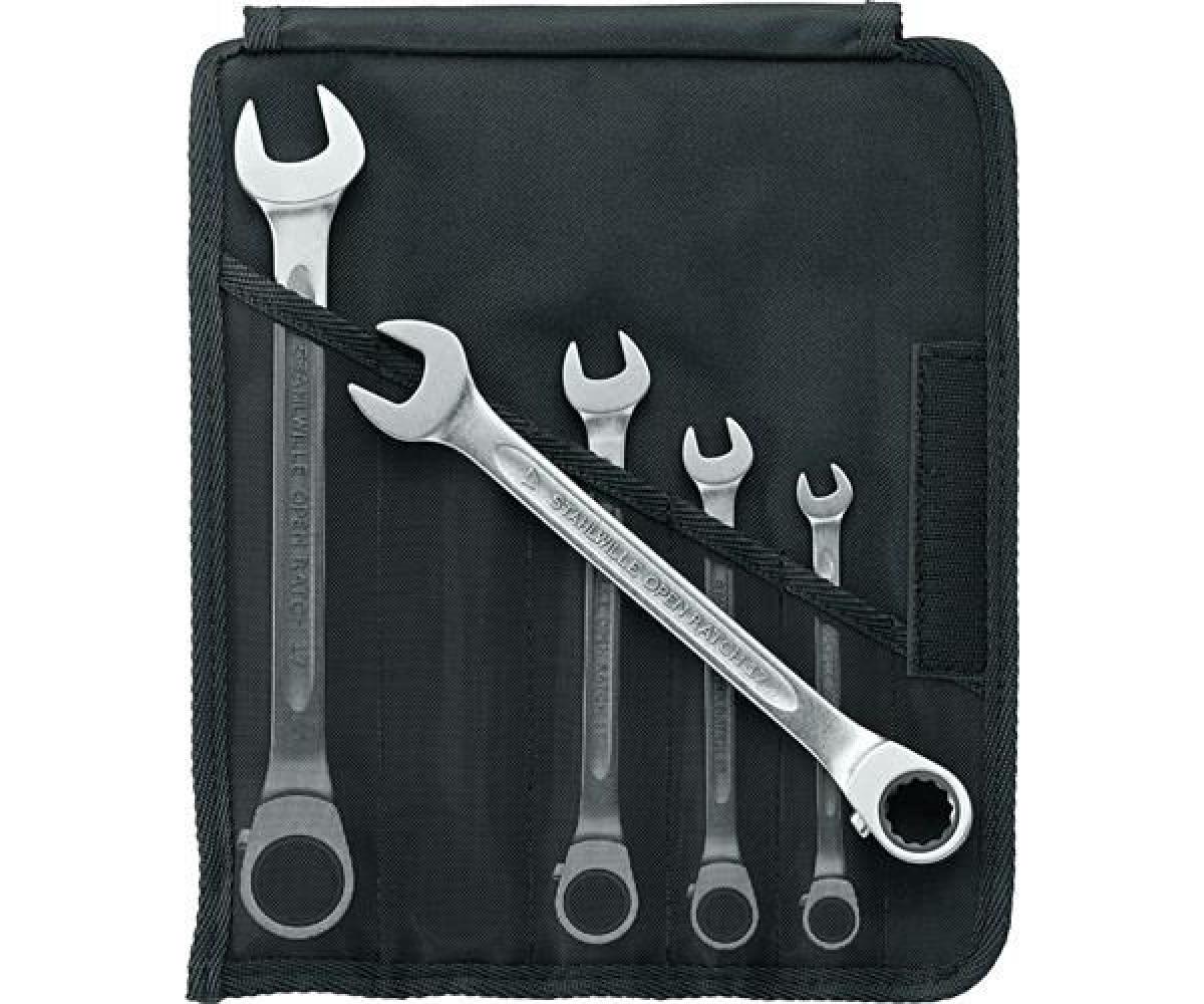 Weitere technische Eigenschaften · Zähne: 72 · Verpackung: Rolltasche · Material: Chrom-Alloy-Stahl · Schlüsselweiten: 8-19mm · Maulringratschenschlüssel · satz 17/5 5-tlg.SW 8-19mm · umschaltb.STAHLWILLE · Inhalt: 4000 826 075 je 1 Knarren-Ring-Maulschlüssel Gr. 8 / 10 / 13 / 17 / 19 mm 4000 826 076 je 1 Knarren-Ring-Maulschlüssel Gr. 8 / 9 / 10 / 11 / 12 / 13 / 14 / 15 / 16 / 17 / 18 / 19 mm ·