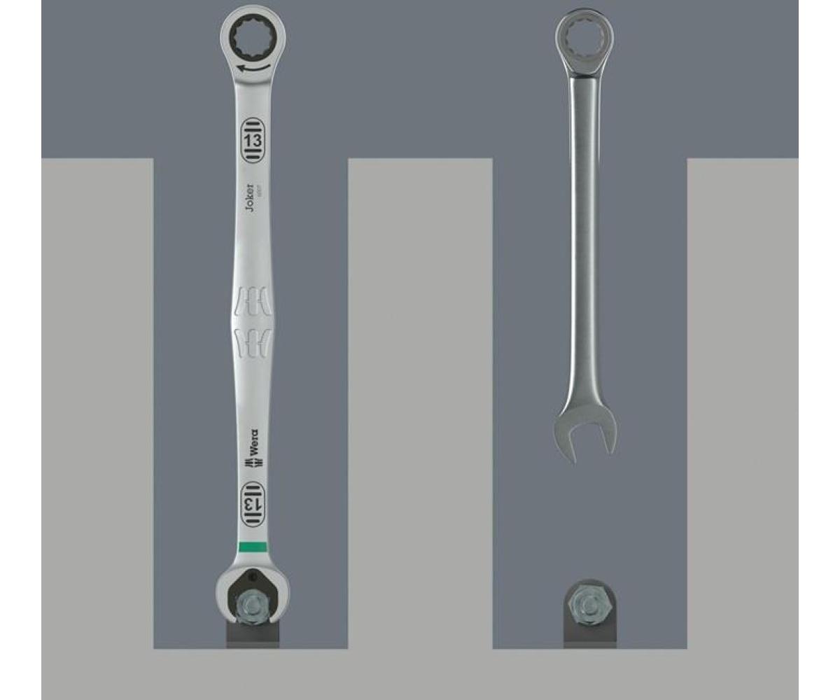 einzigartige Kombination aus Maul- und Ring-Ratschenmechanik in langer Ausführung · langer Hebel ermöglicht höhere Kraftübertragung · bessere Zugänglichkeit bei tiefliegenden Verschraubungen · kein Abrutschen durch Endanschlag · mit praktischer Haltefunktion durch Metallplatte im Maul