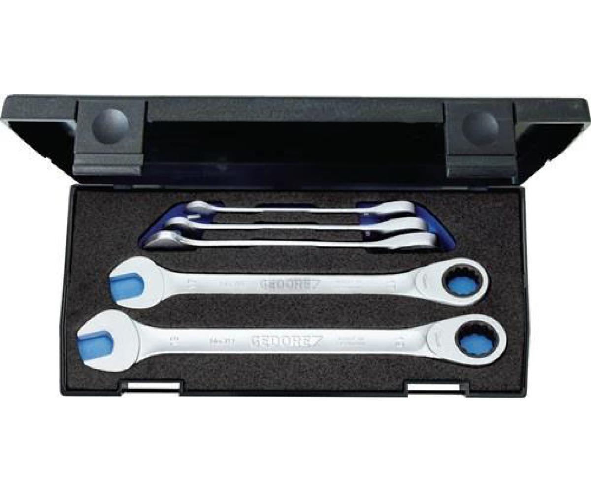 Weitere technische Eigenschaften · Zähne: 60/52 · Verpackung: Kunststoffkasten · Material: Chrom-Vanadium-Stahl · Schlüsselweiten: 8-19mm · Maulringratschenschlüssel · satz 7R-005 5-tlg.SW · 8-19mm ger.GEDORE · Inhalt: je 1 Knarren-Ring-Maulschlüssel 8 / 10 / 13 / 17 / 19 mm ·