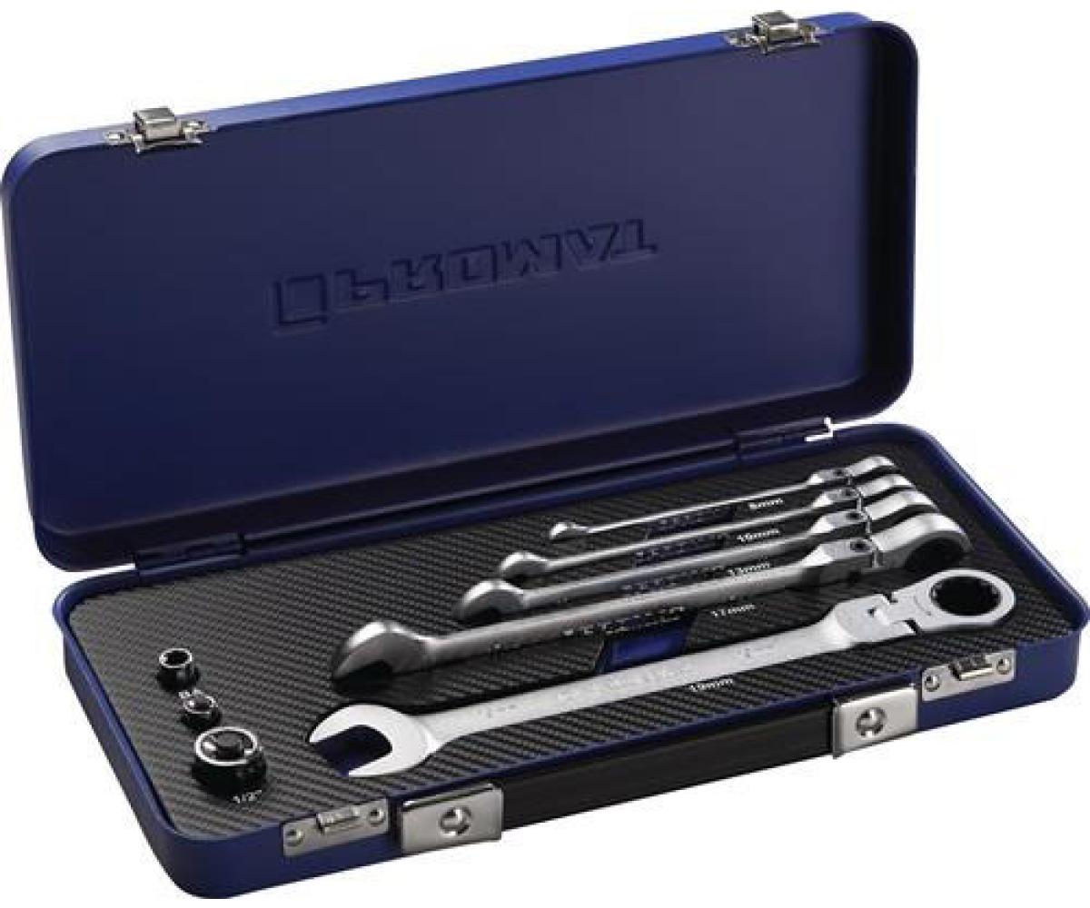 Inhalt: je 1 Knarren-Ring-Maulschlüssel Gr. 8 / 10 / 13 / 17 / 19 mm je 1 Adapter für Steckschlüssel-Einsätze 6,3 mm (1/4") x 10 mm 12,5 mm (1/2") x 19 mm 1 Adapter für Bits 6,3 mm (1/4") x 10 mm Lieferung in StahlblechkassetteTechnische Daten