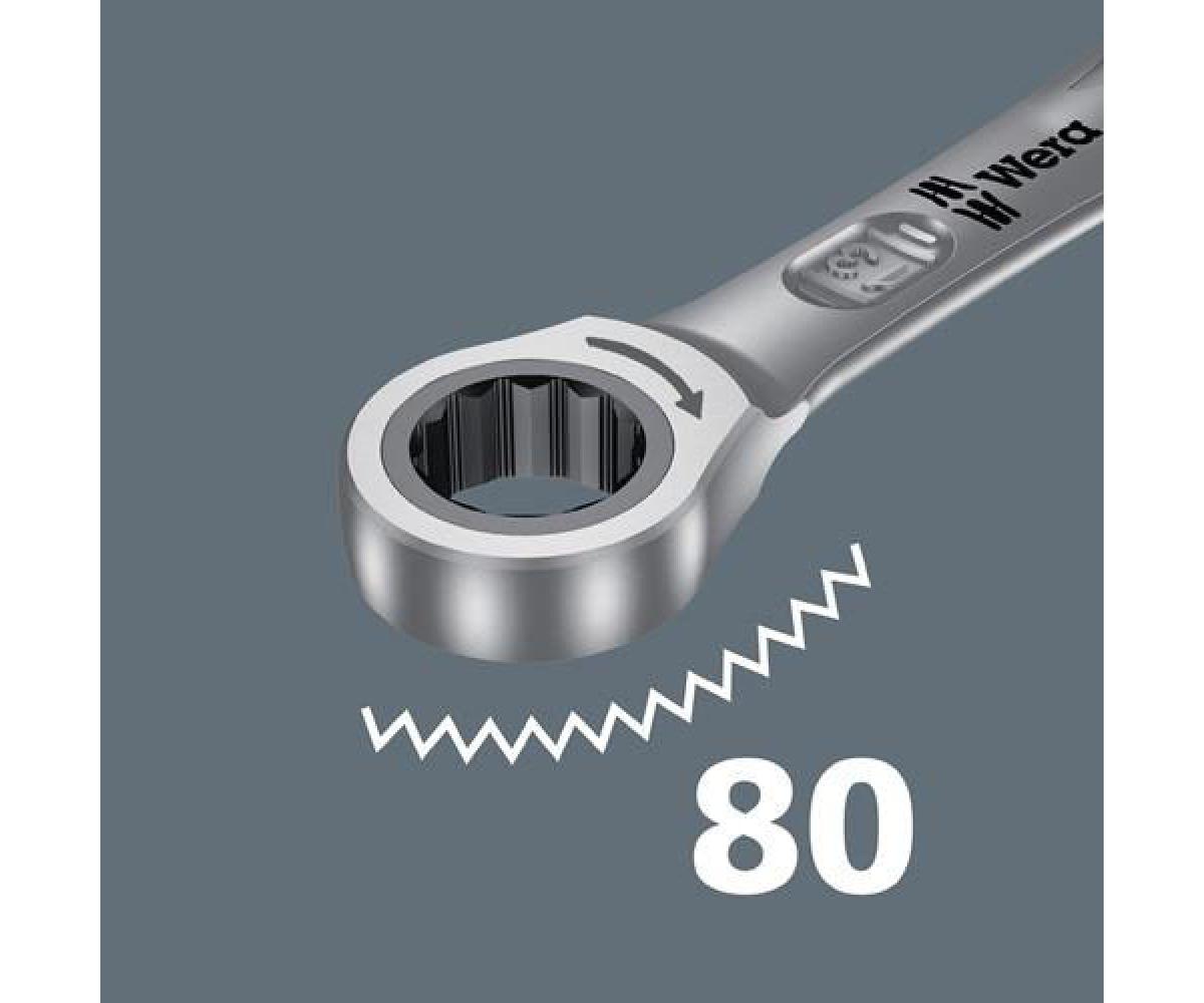 Weitere technische Eigenschaften · Zähne: 80 · Verpackung: Tasche · Material: legierter Werkzeugstahl · Schlüsselweiten: 8-19mm · Maulringratschenschlüssel · satz Joker 11-tlg.SW · 8-19mm ger.WERA · Sein Plus auf der Maulseite: - Haltefunktion für Muttern durch eine Metallplatte im Maul - kein Abrutschen durch Endanschlag - kleiner Rückschwenkwinkel von nur 30° Sein Plus auf der Ringseite: außergewöhnlich hohe Feinverzahnung mit 80 Zähnen ·