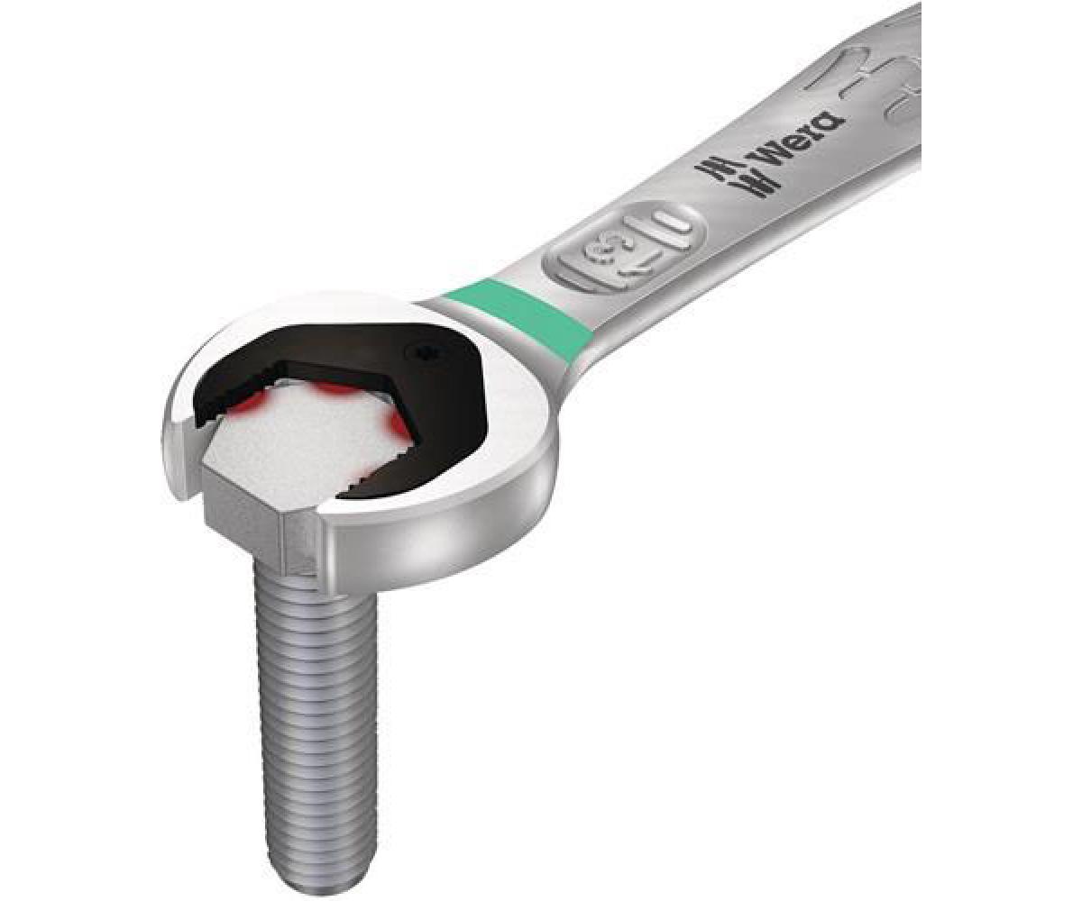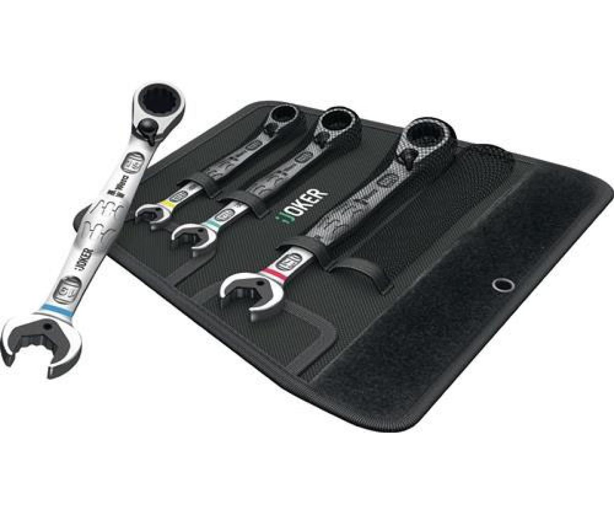 Weitere technische Eigenschaften · Zähne: 80 · Verpackung: Tasche · Material: legierter Werkzeugstahl · Schlüsselweiten: 10-19mm · Maulringratschenschlüssel · satz Joker 4-tlg.SW · 10-19mm · d gekr.WERA · Sein Plus auf der Maulseite: - Haltefunktion für Muttern durch eine Metallplatte im Maul - kein Abrutschen durch Endanschlag - kleiner Rückschwenkwinkel von nur 30° Sein Plus auf der Ringseite: außergewöhnlich hohe Feinverzahnung mit 80 Zähnen ·