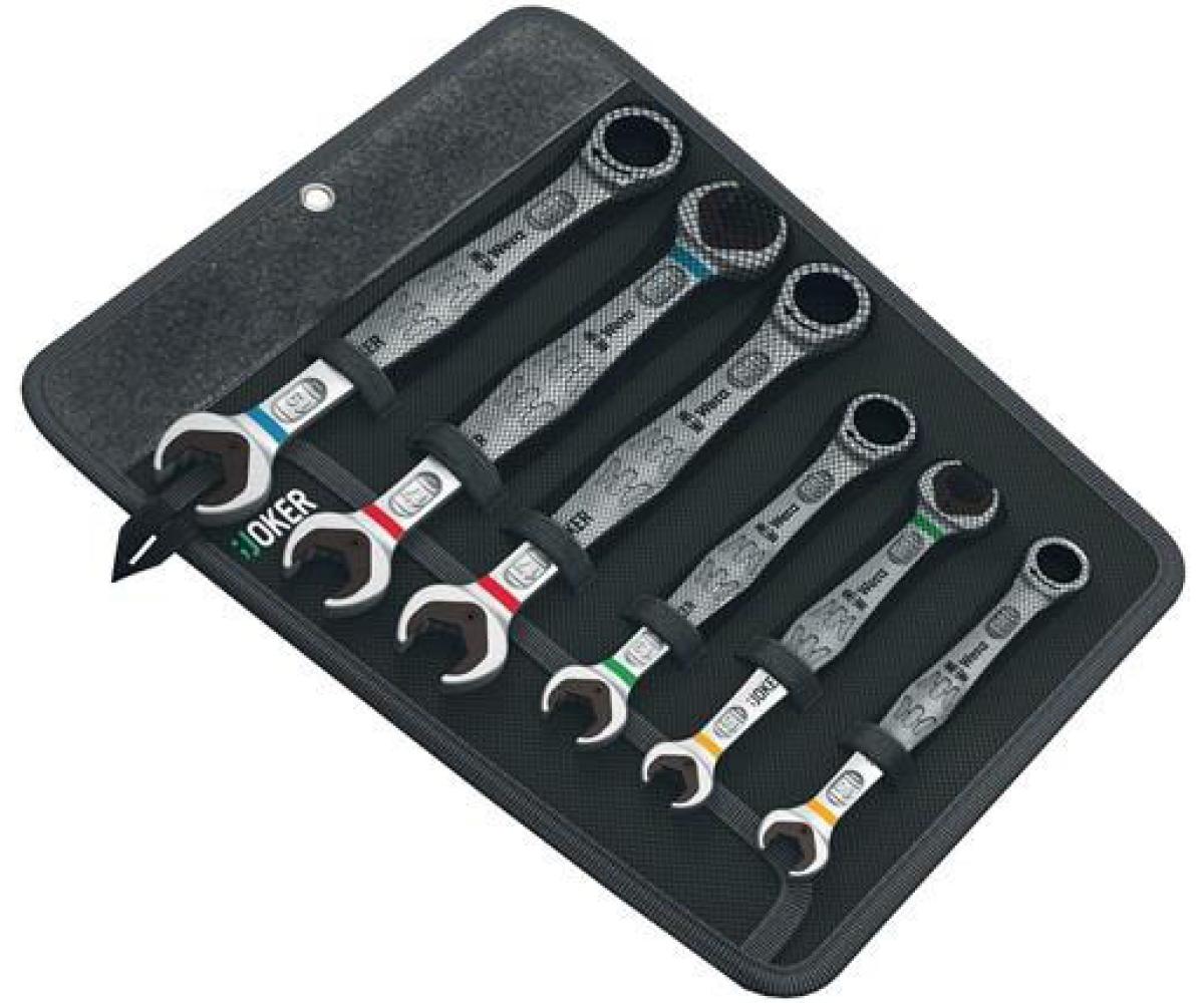 Weitere technische Eigenschaften · Zähne: 80 · Verpackung: Tasche · Material: legierter Werkzeugstahl · Schlüsselweiten: 10-19mm · Maulringratschenschlüssel · satz Joker 6-tlg.SW · 10-19mm ger.WERA · Sein Plus auf der Maulseite: - Haltefunktion für Muttern durch eine Metallplatte im Maul - kein Abrutschen durch Endanschlag - kleiner Rückschwenkwinkel von nur 30° Sein Plus auf der Ringseite: Ratschenmechanik auf der Ringseite: Außergewöhnlich hohe Feinverzahnung mit 80 Zähnen ·