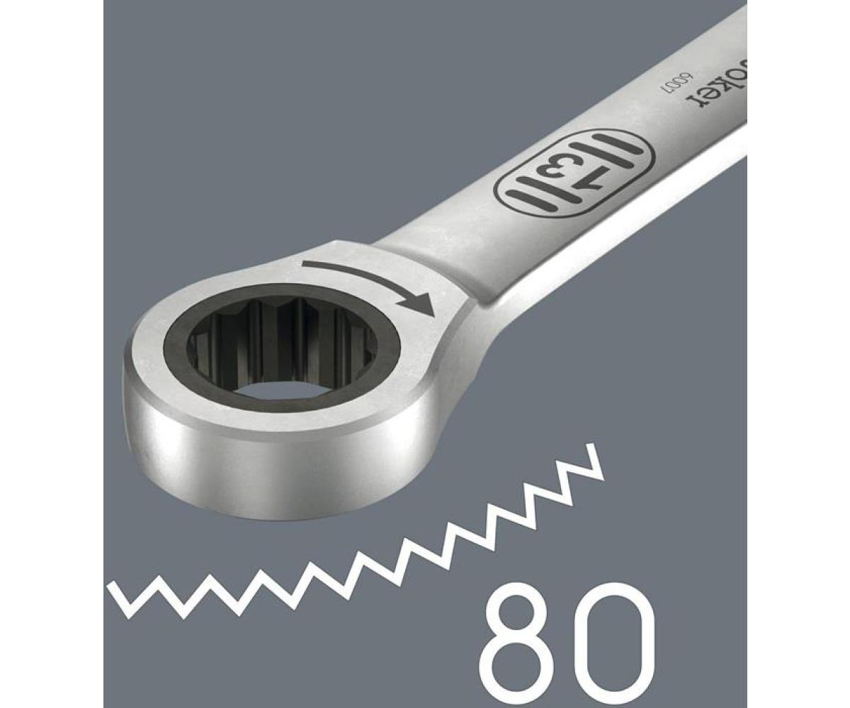 einzigartige Kombination aus Maul- und Ring-Ratschenmechanik in langer Ausführung · langer Hebel ermöglicht höhere Kraftübertragung · bessere Zugänglichkeit bei tiefliegenden Verschraubungen · Kein Abrutschen durch Endanschlag · mit praktischer Haltefunktion durch Metallplatte im Maul