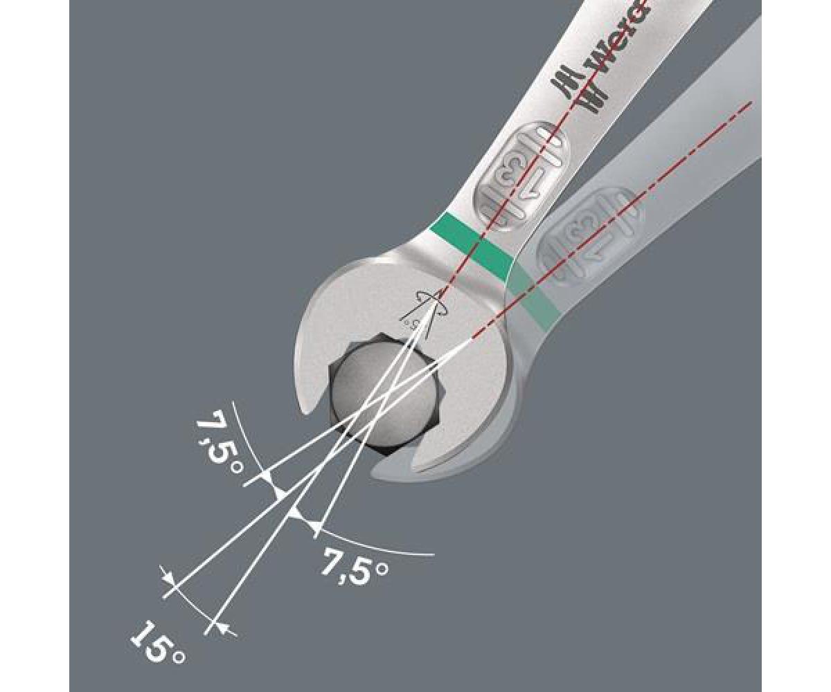 dank kleinem Rückholwinkel von nur 15° auch für besonders enge Bauräume geeignet · Ringseite um 15° abgewinkelt · Maulseite 7,5° geschwenkt · mit Farbleitsystem "Take it easy" Besonderheit: durch die Kombination des um 7,5° geschwenkten Mauls und der Doppelsechskantgeometrie wird eine Verdopplung der Ansetzpunkte erzielt · bei einer wiederholten 180°-Drehung des Schlüssels um die Längsachse gibt es 4 Ansetzmöglichkeiten und Muttern und Schrauben können alle 15° gepackt werden