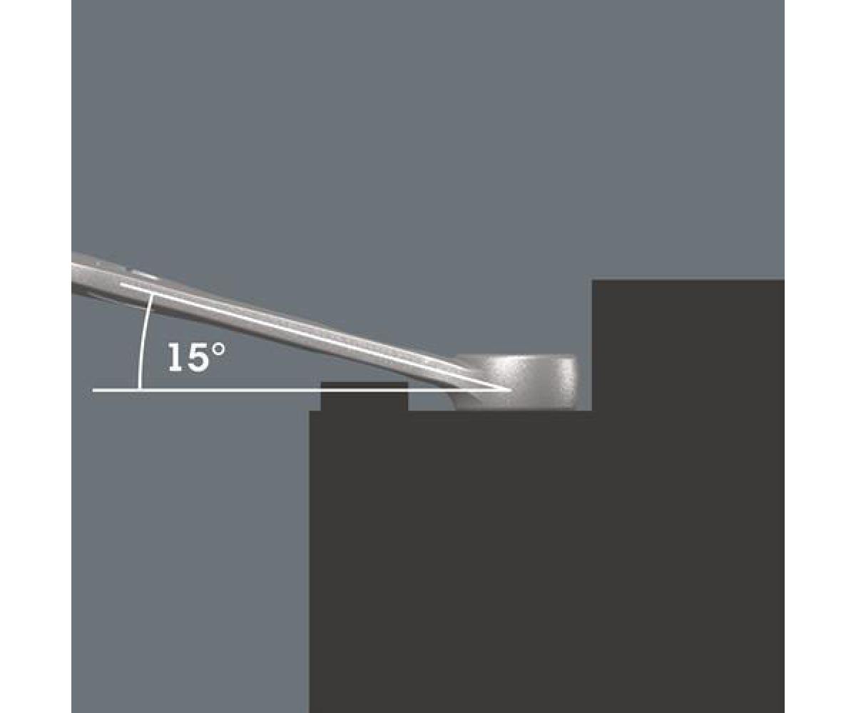 dank kleinem Rückholwinkel von nur 15° auch für besonders enge Bauräume geeignet · Ringseite um 15° abgewinkelt · Maulseite 7,5° geschwenkt · mit Farbleitsystem "Take it easy" Besonderheit: durch die Kombination des um 7,5° geschwenkten Mauls und der Doppelsechskantgeometrie wird eine Verdopplung der Ansetzpunkte erzielt · bei einer wiederholten 180°-Drehung des Schlüssels um die Längsachse gibt es 4 Ansetzmöglichkeiten und Muttern und Schrauben können alle 15° gepackt werden