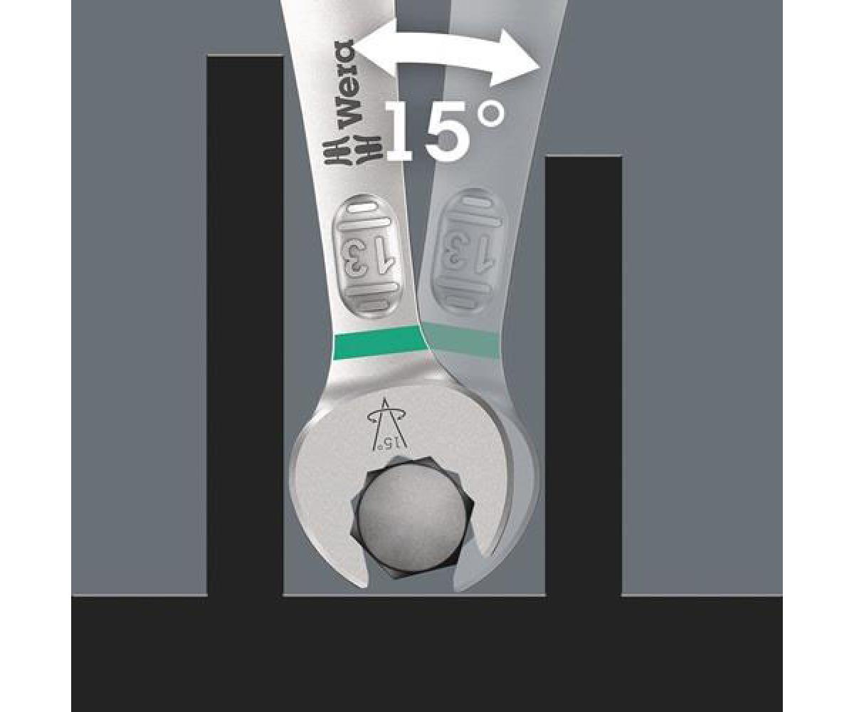 dank kleinem Rückholwinkel von nur 15° auch für besonders enge Bauräume geeignet · Ringseite um 15° abgewinkelt · Maulseite 7,5° geschwenkt · mit Farbleitsystem "Take it easy" Besonderheit: durch die Kombination des um 7,5° geschwenkten Mauls und der Doppelsechskantgeometrie wird eine Verdopplung der Ansetzpunkte erzielt · bei einer wiederholten 180°-Drehung des Schlüssels um die Längsachse gibt es 4 Ansetzmöglichkeiten und Muttern und Schrauben können alle 15° gepackt werden