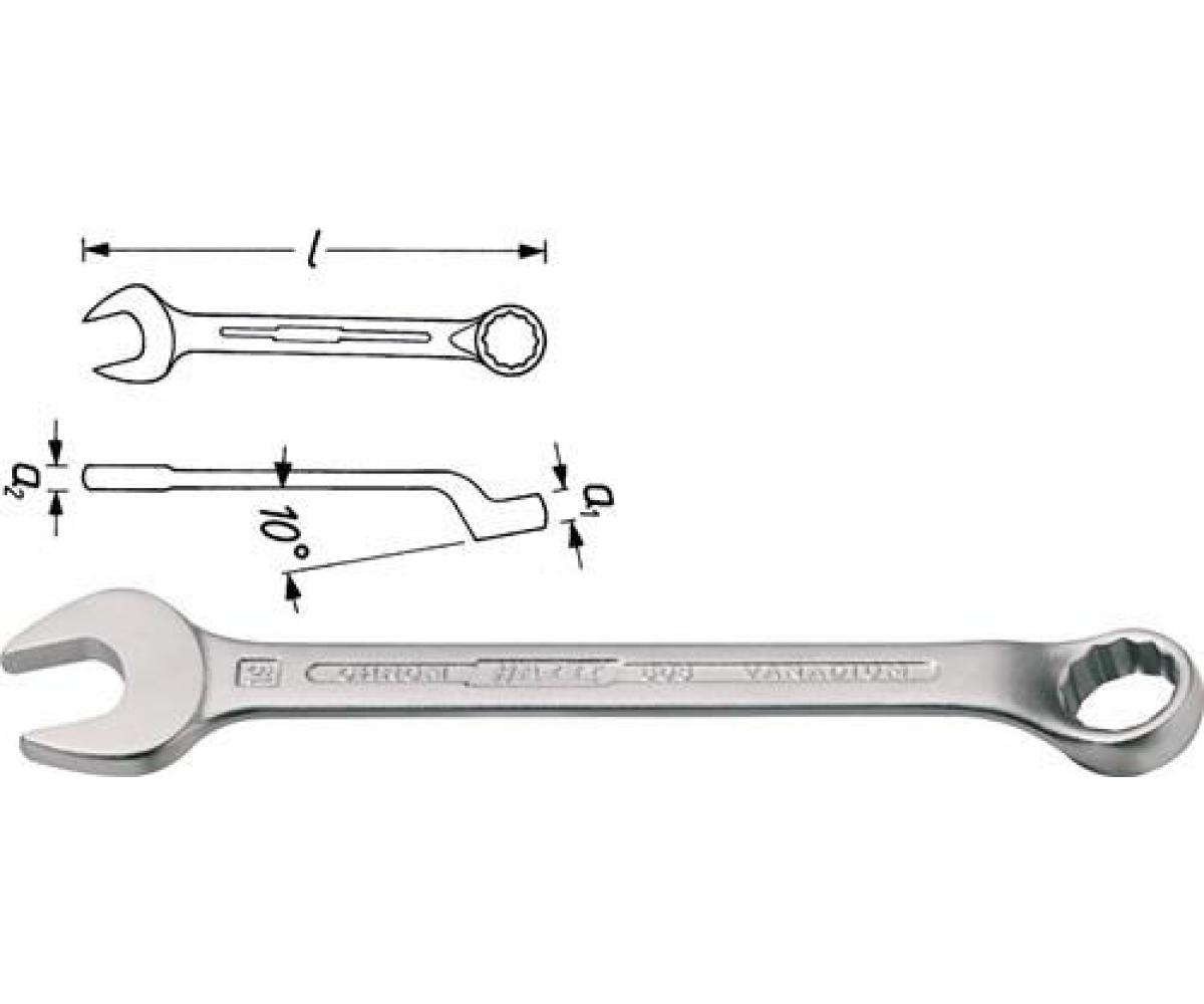 CV-Stahl · verchromt · mit gleichen Schlüsselweiten · Ringseite 10° gekröpft, Maulstellung 15° · Schlüsselweite 5,5 bis 9 mm Ringseite mit Sechskant, ab Schlüsselweite 10 mm Ringseite mit Doppelsechskant DIN 3113 Form B / ISO 3318 / ISO 7738