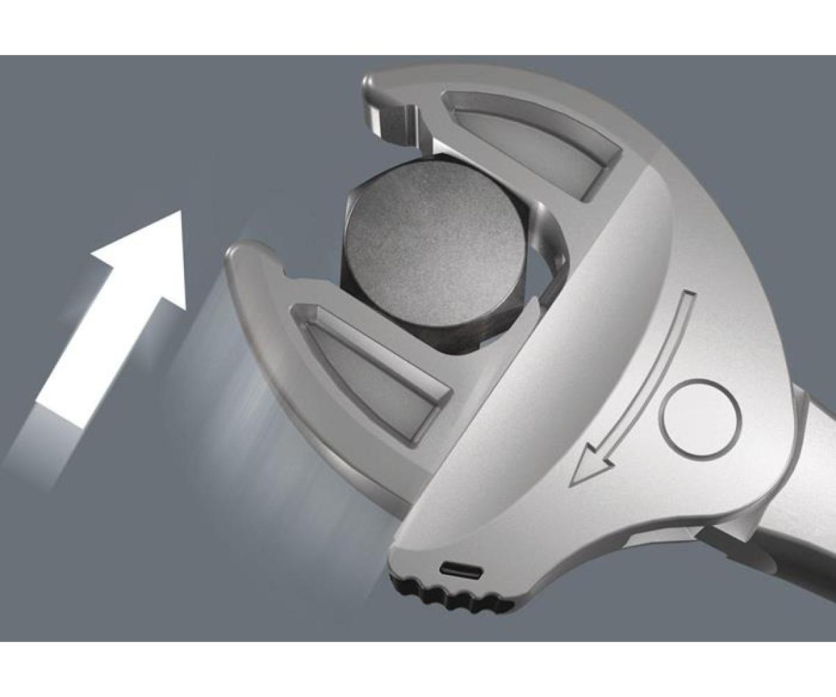 selbstjustierender Doppelmaulschlüssel mit Ratschenfunktion · größenverstellbare Maulseiten · parallel geführte glatte Backen · mit 30° Rückschwenkwinkel über die Eckweitenprismen im Maul