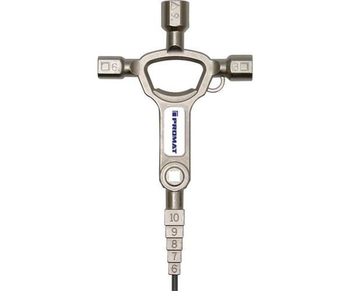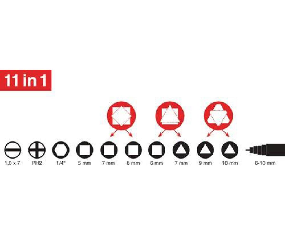 für alle gängigen Absperrsysteme der Gas-, Wasser- und Elektrizitätsversorgung sowie für technische Anlagen in Gebäuden wie Klima- und Belüftungsanlagen, Absperrventile, Netzschalttafeln usw. · mit Flaschenöffner-Funktion Funktionen: 1. Innensechskantschlüssel 3 mm 2. Innenvierkant 5 mm 3. Innenvierkant 6 mm 4. Innenvierkant 7 mm 5. Innenvierkant 8 mm 6. Innendreikant 7 mm 7. Innendreikant 9 mm 8. Innendreikant 10 mm 9. stufiger Vierkant 6-10 mm 10. Wendebit: Kreuz PH 2 + Schlitz 1,0 x 7 mm 1/4"-Bitaufnahme inkl. Magnet