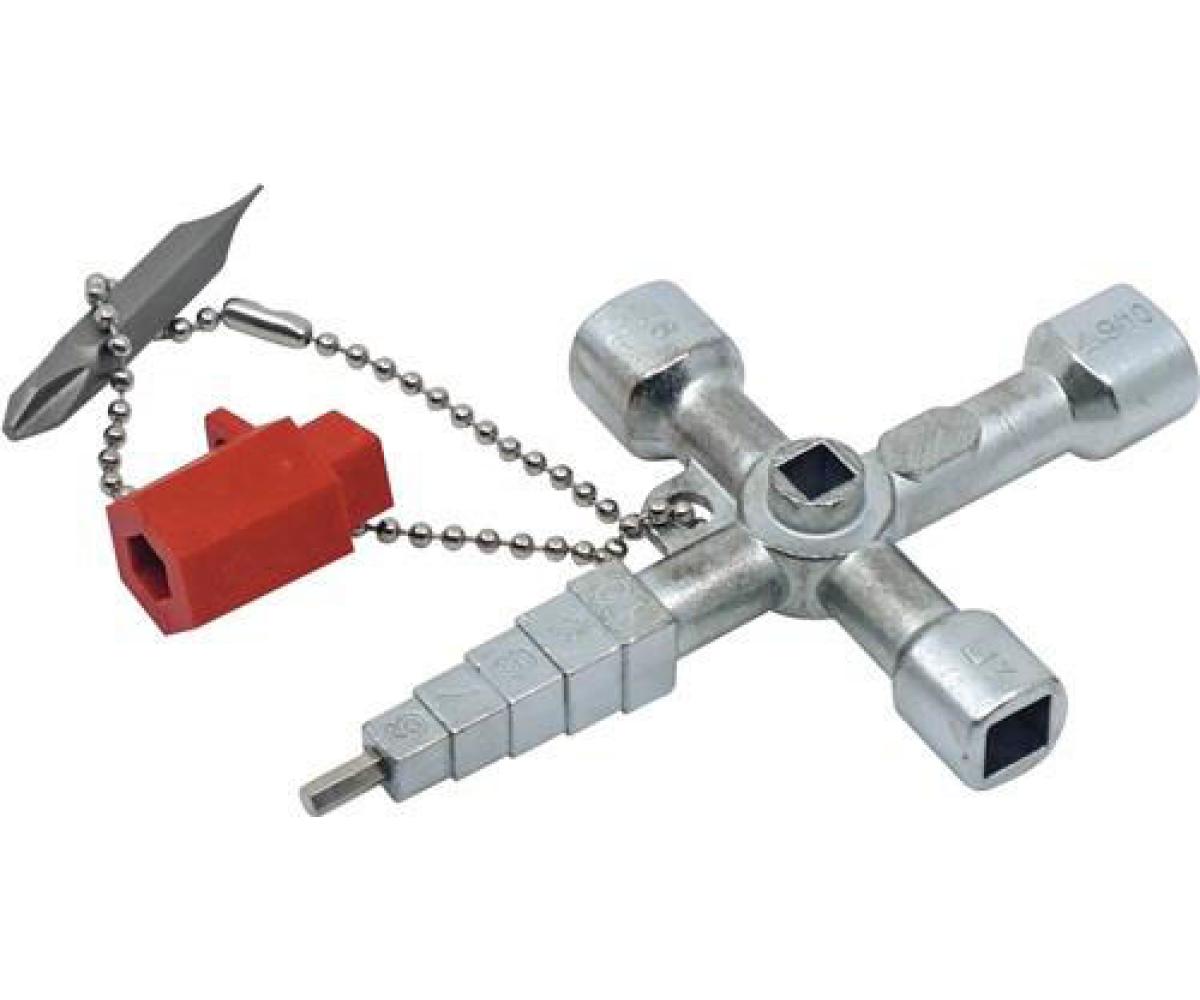 Weitere technische Eigenschaften · Breite: 62mm · Länge: 89mm · Material: Zink-Druckguss · Höhe: 15mm · Schaltschrankschlüssel · 820 M03 13 Funktionen · m.Bitadapter SCHUEBO · Funktionen: 1. stufiger Vierkant 6 - 10 mm 2. Innenvierkant 7 - 8 mm 3. Innendreikant 9 mm 4. Innendreikant 10 mm 5./6. Doppelbit Kreuz PH Gr. 2 / Schlitz 7 mm Kunststoffadapter für Bits 6,3 mm (1/4 ”) Entlüftungsvierkant 5 mm ·
