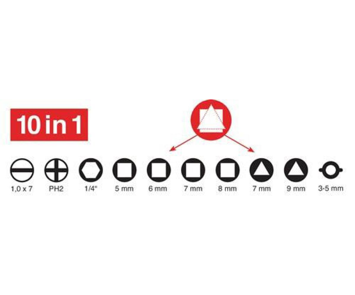 Weitere technische Eigenschaften · Breite: 72mm · Länge: 72mm · Material: Zinkdruckguss · Höhe: 15mm · Schaltschrankschlüssel · Univ.10 Funktionen · m.Bitadapter SCHUEBO · Funktionen: 1. Innenvierkant 5 mm 2. Innenvierkant 6 mm 3. Innenvierkant 7 - 8 mm 4. Innendreikant 7 mm 5. Innendreikant 9 mm 6. Doppelbart 3 - 5 mm 7./8. PH Gr. 2 / Schlitz 7 mm und Kunststoffadapter für Bits 6,3 mm (1/4 ”) ·