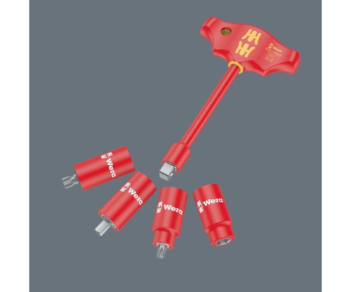 Form des Quergriffs ermöglicht die Übertragung besonders hoher Anzieh- und Lösemomente · Geometrie des Griffs füllt die ganze Hand gut aus und die Finger liegen fest in den weich gerundeten Griffmulden, dadurch ist eine optimale, ergonomische Kraftübertragung gewährleistet · stückgeprüftes Werkzeug gem. IEC 60900 bei 10.000 V für sicheres Arbeiten bei der zugelassenen Spannung von 1.000 V · nur erlaubt für 3/8" VDE-Bitnüsse und -Steckschlüsseleinsätze der Wera Zyklop VDE Serien 8740, 8760, 8767, 8790 · der ummantelte Griff schützt auch empfindliche Oberflächen vor Beschädigungen