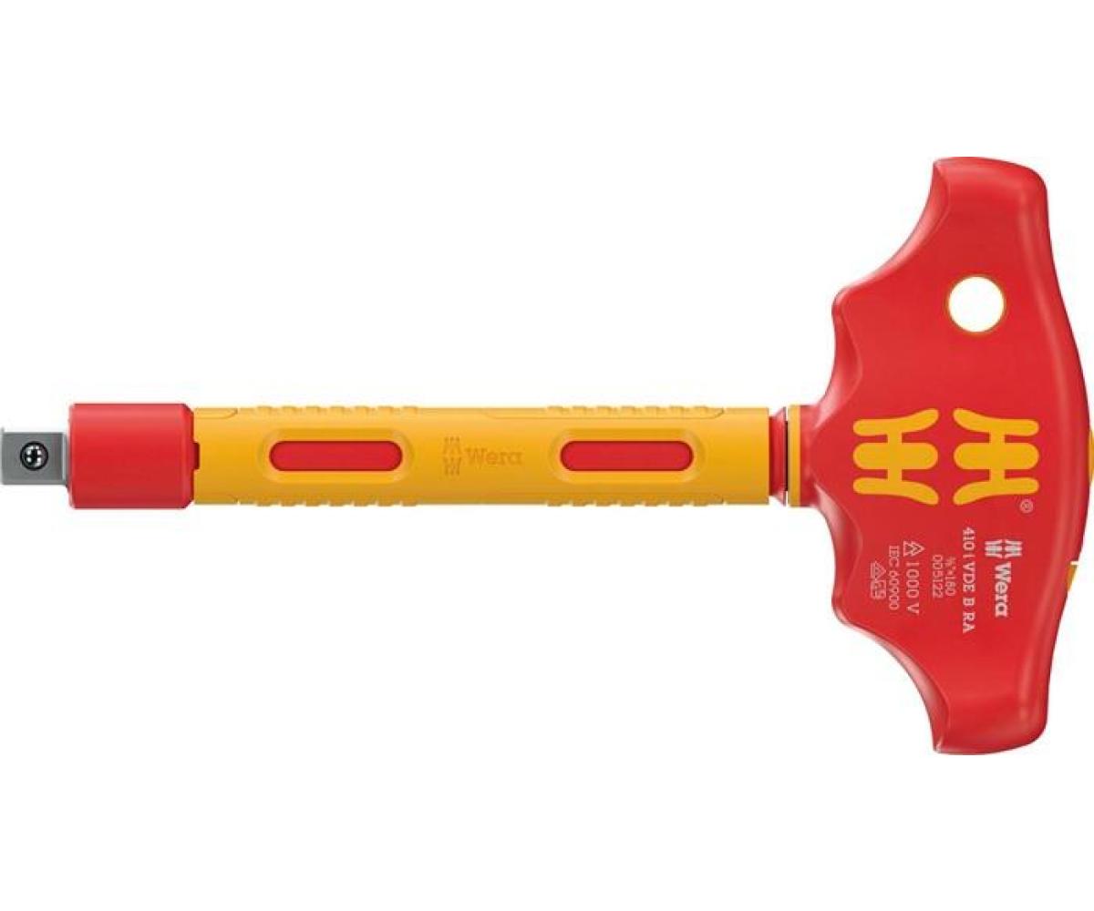 Weitere technische Eigenschaften · Griffdurchmesser: 99mm · Grifflänge: 49mm · GS - Geprüfte Sicherheit: ja · Icon links: Innenvierkant · Klingenlänge: 130mm · Klingenlänge (in Zoll): 5 1/8"Zoll · Rückholwinkel: 4,5Grad · Schnelldrehhülse VDE Quergriff: ja · Steckschlüsseleinsatz 410 · i VDE B RA 3/8 Zoll WERA ·