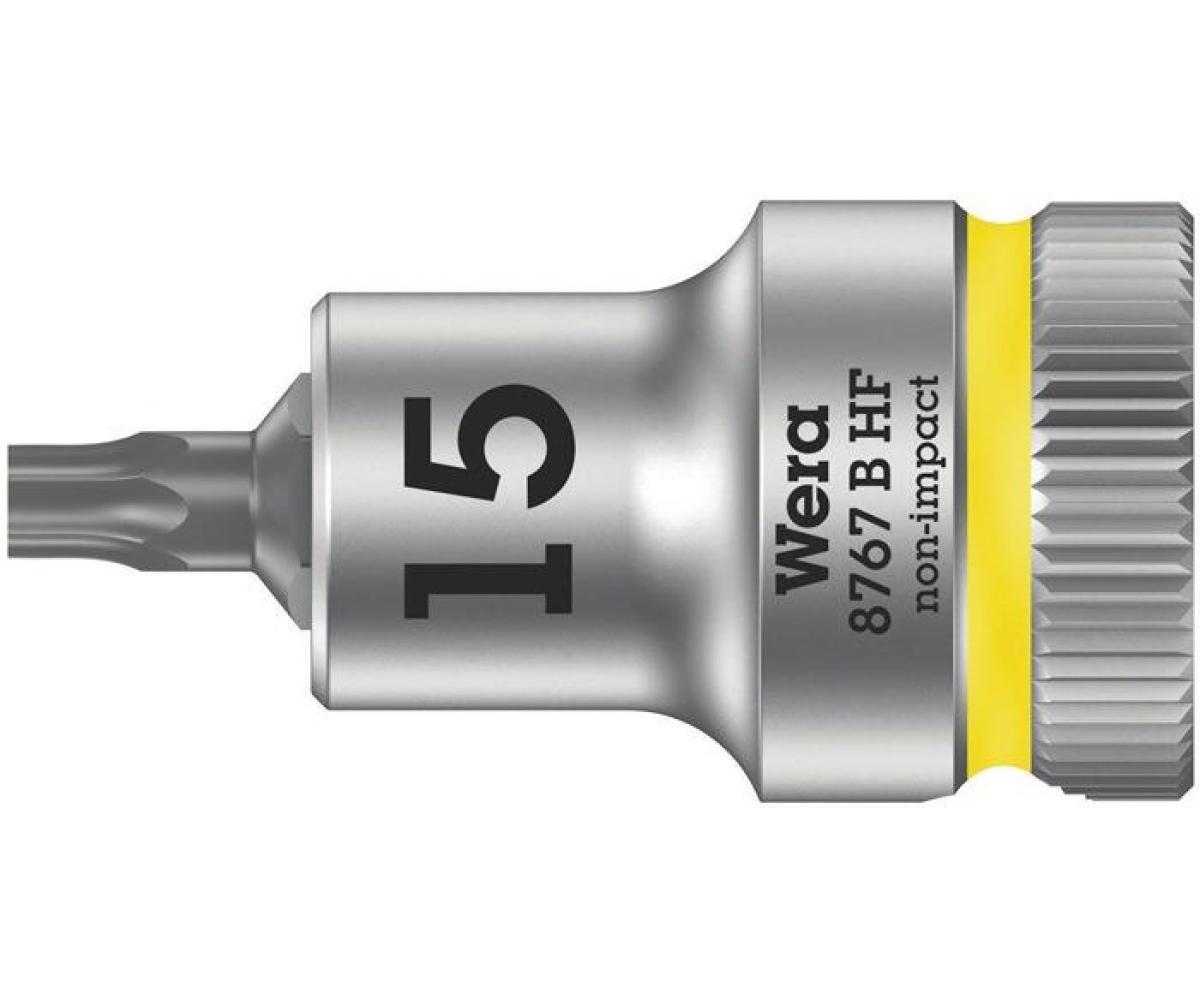 Weitere technische Eigenschaften · Material: Chrom-Vanadium-Stahl · Außenmaß (d1): 12,0mm · Durchmesser hinten (d2): 17,5mm · Farbe: leuchtgelb · Höhe Abtrieb: 9,0mm · Mit Haltefunktion für Innen-TORX®-Schrauben: ja · Take it easy Nuss: ja · Schraubendrehereinsatz · 8767 B HF Torx 3/8 Zoll · TORX® TX 15 L.35mm WERA ·