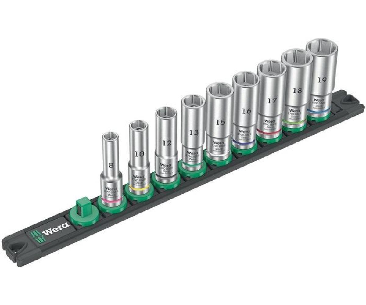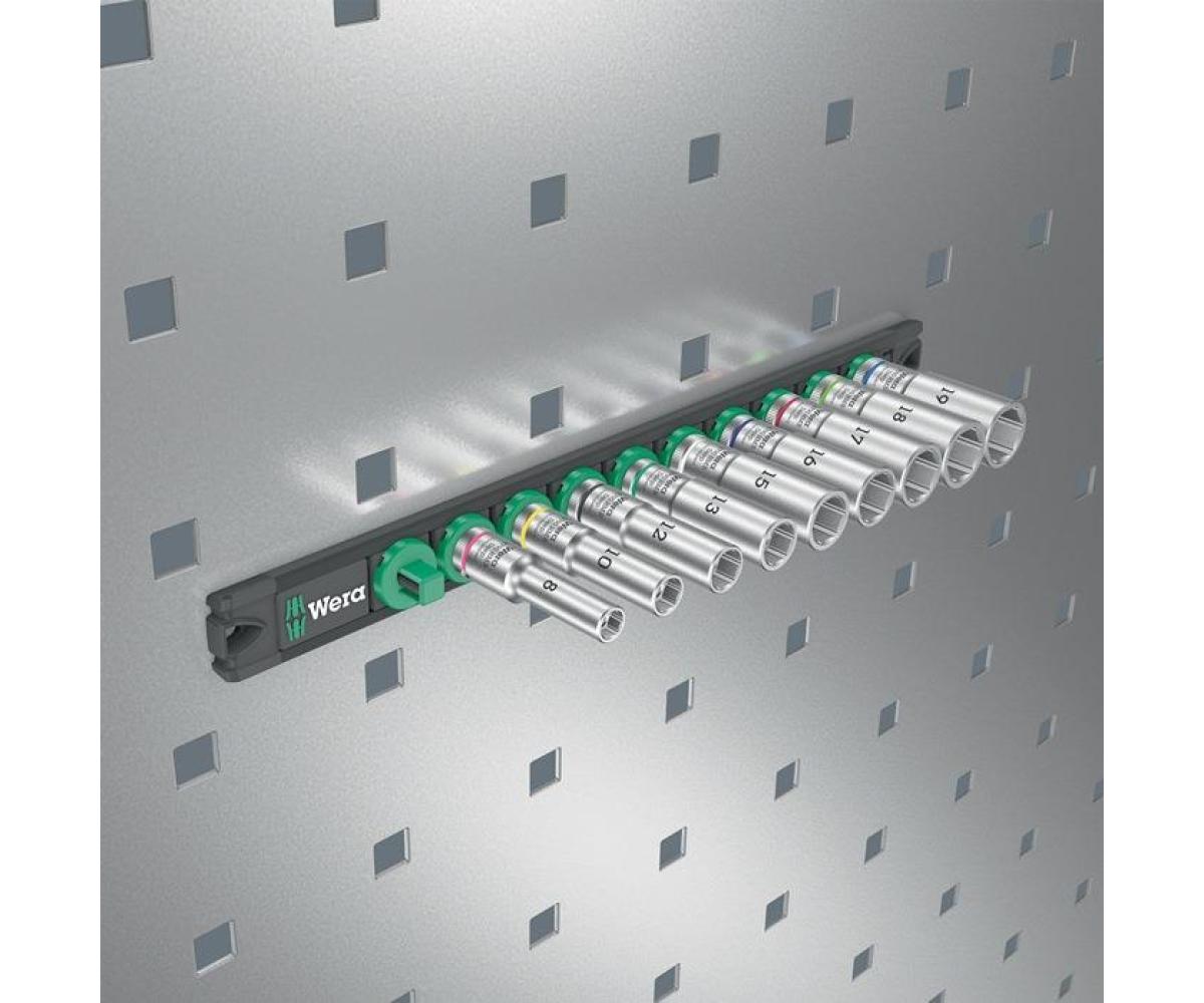 Nuss-Magnetleiste mit 9 langen Hand- und Maschinensteckschlüssel-Einsätzen (non-impact) · 3/8". Ein leichtgängiger Drehmechanismus sorgt für einen sicheren Halt und leichte Entnahme der Nüsse. Lange 3/8" Hand- und Maschinensteckschlüssel-Einsätze (ISO 2725-Teil 3) von Wera für den Einsatz im Hand- und Maschinenbetrieb (non impact) auch bei tiefliegenden Verschraubungen und überstehenden Gewindestangen. Mit Take it easy Werkzeugfinder mit Farbkennzeichnung nach Größen - zum einfachen und schnellen Finden des benötigten Werkzeugs. Griffig zum leichten Greifen auch mit öligen Händen. Mit Sechskantprofil und Kugelfangrille. Das Sechskantprofil ermöglicht die Übertragung hoher Kräfte und belastet die Kanten der Schraubenmutter bzw. des Schraubenkopfes weniger als ein Zwölfkantprofil. Feinverzahnte Knarren machen darüber hinaus durch ihren kleinen Rückschwenkwinkel den Einsatz eines Zwölfkantprofils auch in beengten Raumverhältnissen überflüssig. Für Außensechskantschrauben und -muttern. Die Magnetleiste ermöglicht die temporäre Anbringung an metallischen Oberflächen und verfügt dank der Twist to unlock Funktion über eine sichere Nussverriegelung und -entriegelung.