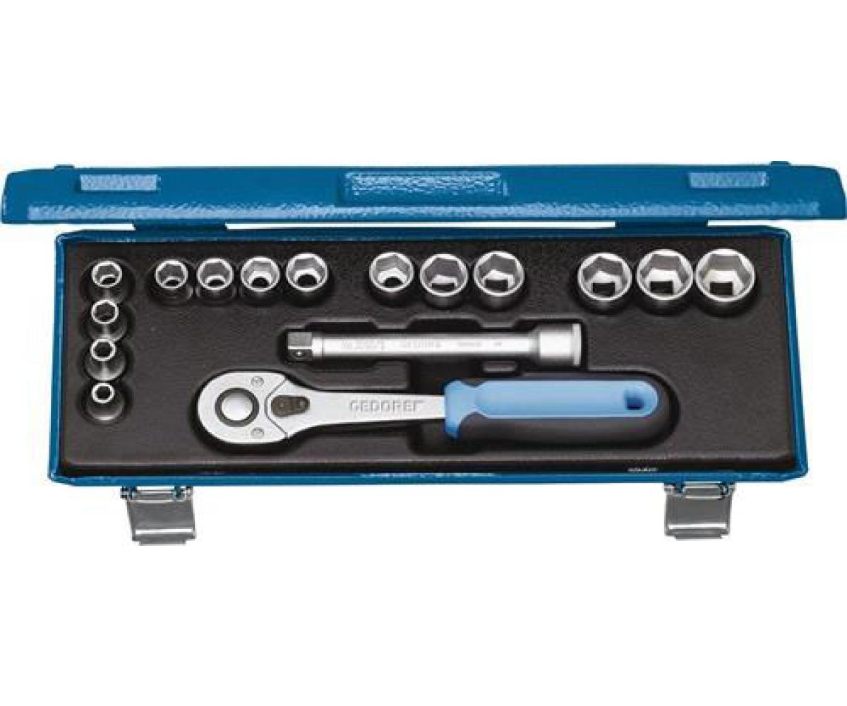 10,0 mm (3/8 ?)-Vierkantantrieb · Chrom-Vanadium-Stahl je 1 Steckschlüssel-Einsatz 6 / 7 / 8 / 9 / 10 / 11 / 12 / 13 / 14 / 15 / 16 / 17 / 18 / 19 mm 1 Verlängerung 125 mm 1 Umschaltknarre mit Schaltscheibe (32 Zähne) mit 2-Komponenten-Griff, Ratschensperre in Mittenstellung des Schalthebels, Nussverriegelungsfunktion mit Druckknopfauslösung Lieferung in Stahlblechkassette