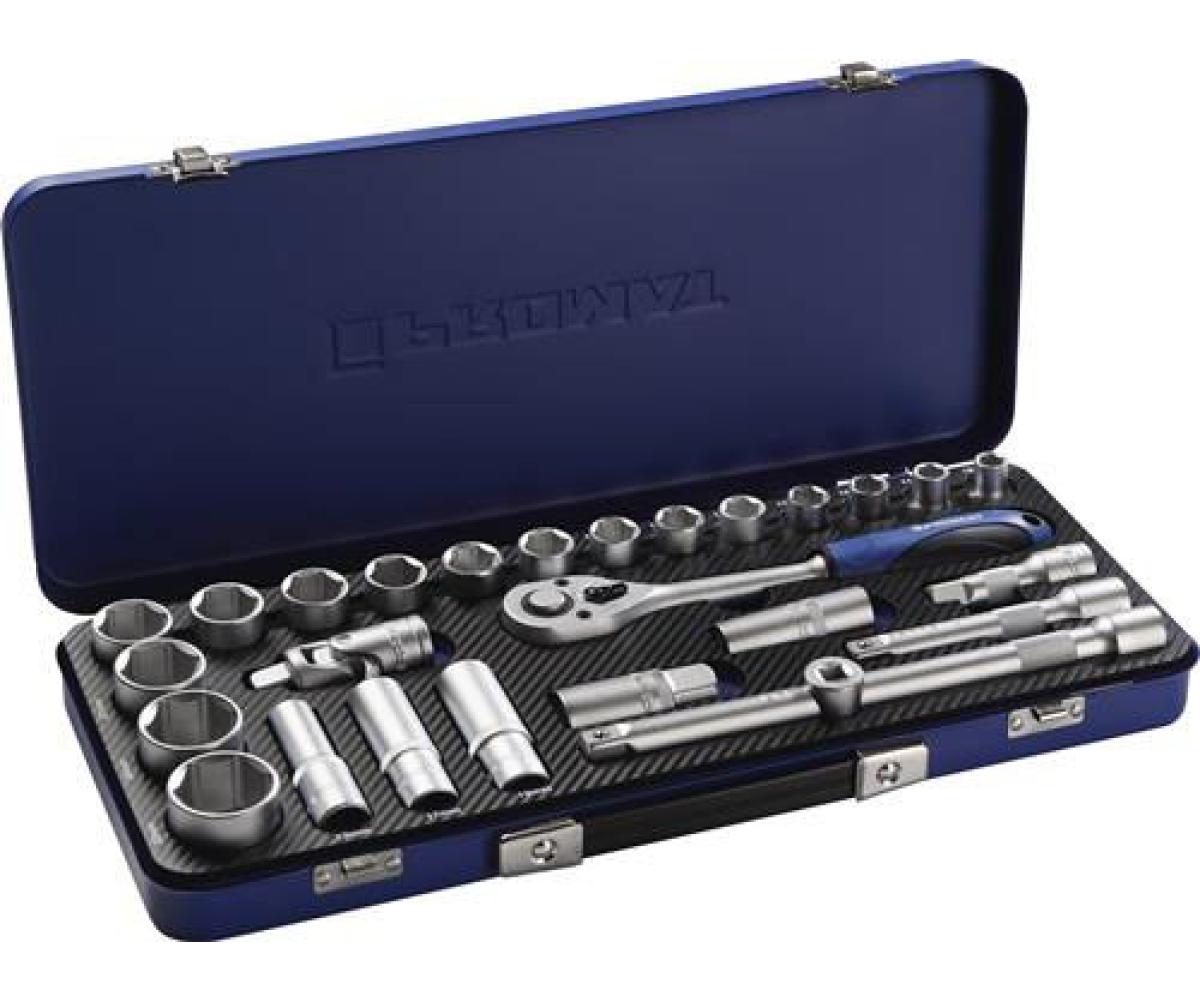 Inhalt: 1 Hebel-Umschaltknarre (36 Zähne) je 1 6-kant-Steckschlüssel-Einsatz SW 10 / 11 / 12 / 13 / 14 / 15 / 16 / 17 / 18 / 19 / 21 / 22 / 24 / 27 / 30 / 32 mm je 1 6-kant-Tiefbett-Steckschlüssel-Einsatz SW 13 / 17 / 19 mm je 1 Steckschlüssel-Einsatz für Zündkerzen 16 / 21 mm je 1 Verlängerung 75 / 125 / 250 mm 1 Kardangelenk 1 Gleitstück Lieferung in StahlblechkassetteTechnische Daten