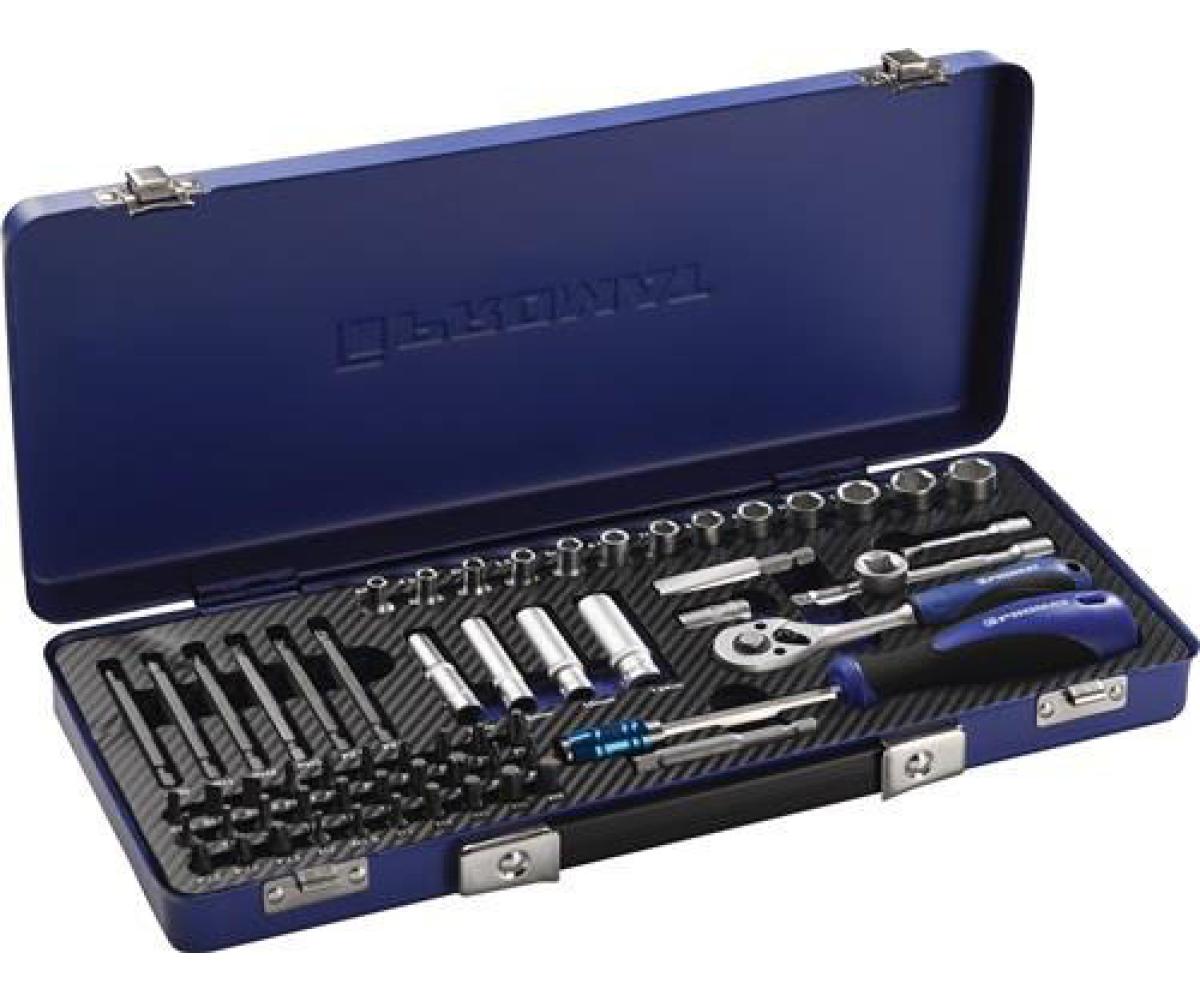 6,3 mm (1/4 ?)-Vierkantantrieb · Steckschlüssel-Einsätze und Bedienelemente aus Chrom-Vanadium-Stahl · matt verchromt · Steckschlüssel-Einsätze mit griffiger Rändelung · Schraubeinsätze aus S2-Stahl · Hebel-Umschaltknarre mit 2-Komponenten-Griff und Nussverriegelungsfunktion mit Druckknopfauslösung · zweifarbige Einlage zur einfachen Werkzeug-Vollzähligkeitskontrolle Inhalt: 1 Hebel-Umschaltknarre (20 Zähne) je 1 6 kant-Steckschlüssel-Einsatz SW 4 / 4,5 / 5 / 5,5 / 6 / 6,5 / 7 / 8 / 9 / 10 / 11 / 12 / 13 mm je 1 6-kant-Tiefbett-Steckschlüssel-Einsatz SW 7 / 8 / 10 / 13 mm je 1 Schrauberbit für Schlitzschrauben 4 / 5,5 / 6,5 mm* Schrauberbits für Schrauben mit Kreuzschlitz (PH): je 1 St. Gr. 00 / 0 / 3, je 2 St. Gr. 1 / 2* je 1 Schrauberbit lange Ausführung (75 mm) für Schrauben mit Kreuzschlitz (PH) Gr. 0 / 1 / 2 / 3 Schrauberbits für Schrauben mit Kreuzschlitz (PZD): 1 St. Gr. 3, je 2 St. Gr. 1 / 2* je 1 Schrauberbit lange Ausführung (75 mm) für Schrauben mit Kreuzschlitz (PZD) Gr. 1 / 2 je 1 Schrauberbit für Schrauben mit Innensechskant-Profil Gr. 2 / 2,5 / 3 / 4 / 5 / 6 / 8 mm* je 1 Schrauberbit für Schrauben mit Innen-TORX-Profil Gr. T 8 / 10 / 15 / 20 / 25 / 27 / 30 / 40* je 1 Verlängerung 50 / 100 mm 1 Gleitstück (auch als Adapter 10,0 mm (3/8 ?) auf 6,3 mm (1/4 ?) zu verwenden 1 Adapter 6,3 mm (1/4 ?)-Außenvierkant auf 6,3 mm (1/4 ?)-Außensechskant** 1 Adapter 6,3 mm (1/4 ?)- Innenvierkant auf 6,3 mm (1/4 ?)- Innensechskant (zum Antrieb von Schrauberbits mit einer Knarre) 1 Handgriff mit Bithalter (mit Magnet und Schnellwechselhalter) mit Mehrkomponentenheft 1 Bithalter mit Magnet * = 25 mm lang ** zum maschinellen Antrieb von Steckschlüsselsätzen (konventioneller Akkuschrauber)