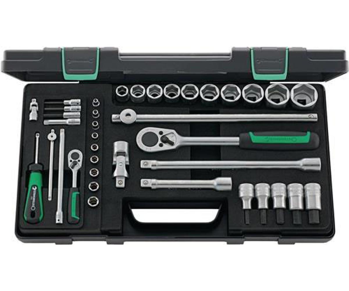 6,3 mm (1/4 ?)- und 12,5 mm (1/2 ?)-Vierkantantrieb · Steckschlüssel-Einsätze und Bedienelemente aus Chrom-Alloy-Stahl Inhalt: mit 6,3 mm (1/4 ?)-Vierkantantrieb 1 Hebel-Umschaltknarre (22 Zähne) mit 2-Komponenten-Griff je 1 6-kant-Steckschlüssel-Einsatz SW 4 / 5 / 5,5 / 6 / 7 / 8 / 9 / 10 / 11 mm je 1 Steckschlüssel-Einsatz für Schrauben mit Innensechskant-Profil Gr. 3 / 4 / 5 mm je 1 Verlängerung 54 / 150 mm 1 Kardangelenk 1 Handgriff mit Vierkant 1 Quergriff mit Gleitstück mit 12,5 mm (1/2 ?)-Vierkantantrieb 1 Hebel-Umschaltknarre (36 Zähne) mit 2-Komponenten-Griff je 1 6-kant-Steckschlüssel-Einsatz SW 13 / 16 / 17 / 18 / 19 / 21 / 22 / 24 / 27 / 30 mm je 1 Steckschlüssel-Einsatz für Schrauben mit Innensechskant-Profil Gr. 6 / 8 / 10 / 12 / 14 mm je 1 Steckschlüssel-Einsatz für Zündkerzen 16 / 21 mm je 1 Verlängerung 130 / 255 mm 1 Kardangelenk 1 Quergriff mit Gleitstück
