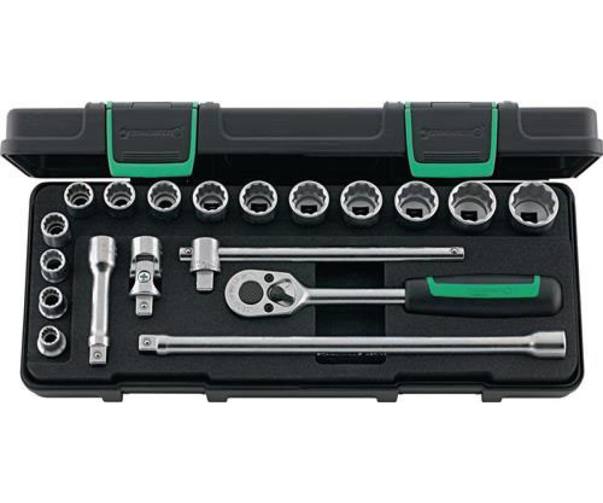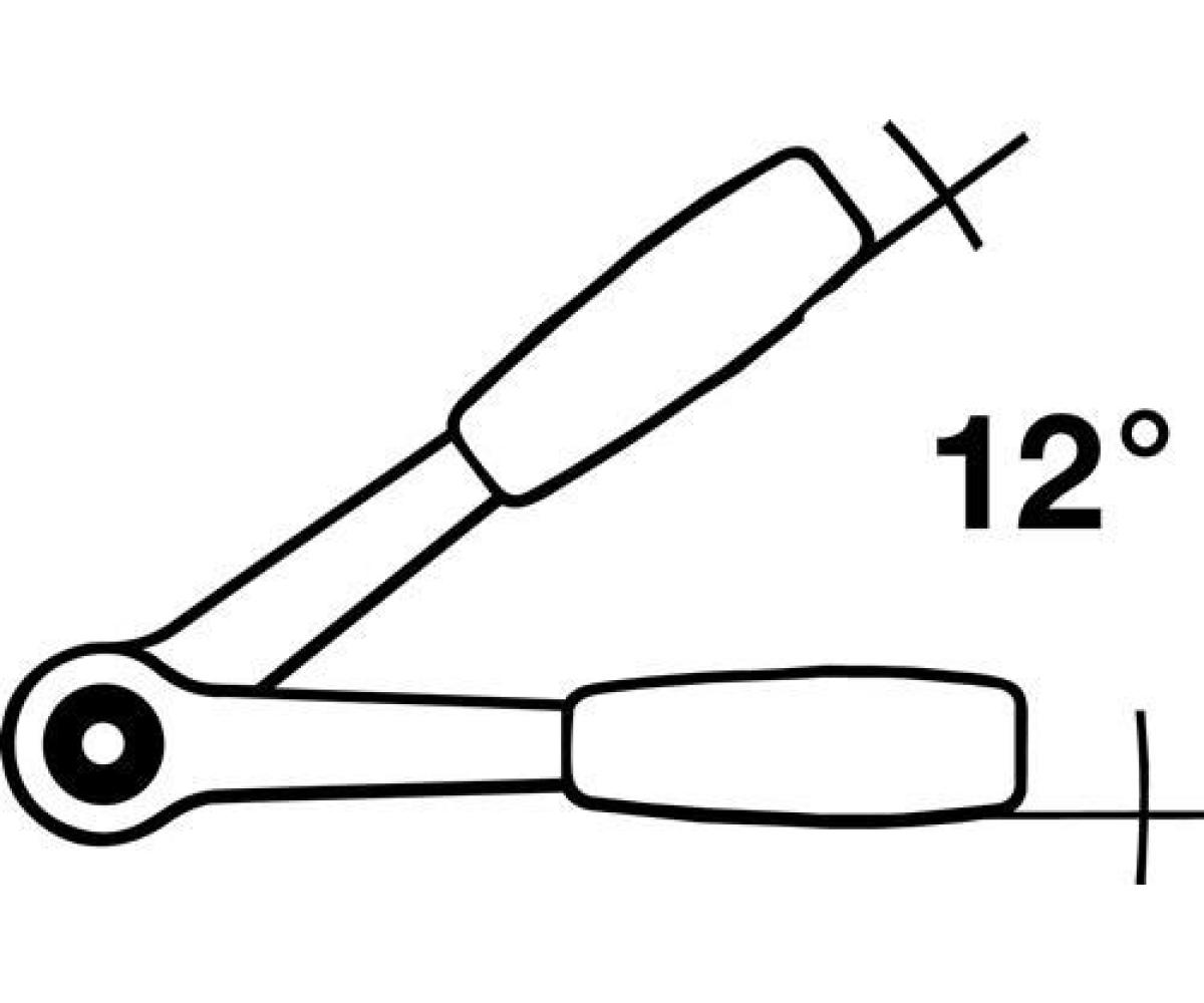 Weitere technische Eigenschaften · Rückschwenkwinkel: 12° · Material: Chrom-Alloy-Stahl · Steckschlüsselsatz · 45/14/5i 19-tlg.3/8 Zoll · SW 8-22mm Z.30 12KT · Inhalt: je 1 12-kant Steckschlüssel-Einsatz SW 8 / 9 / 10 / 11 / 12 / 13 / 14 / 15 / 16 / 17 / 18 / 19 / 21 / 22 mm 1 Hebel-Umschaltknarre (30 Zähne) mit 2-Komponenten-Griff je 1 Verlängerung 76 / 240 mm 1 Quergriff mit Gleitstück 1 Kardangelenk ·