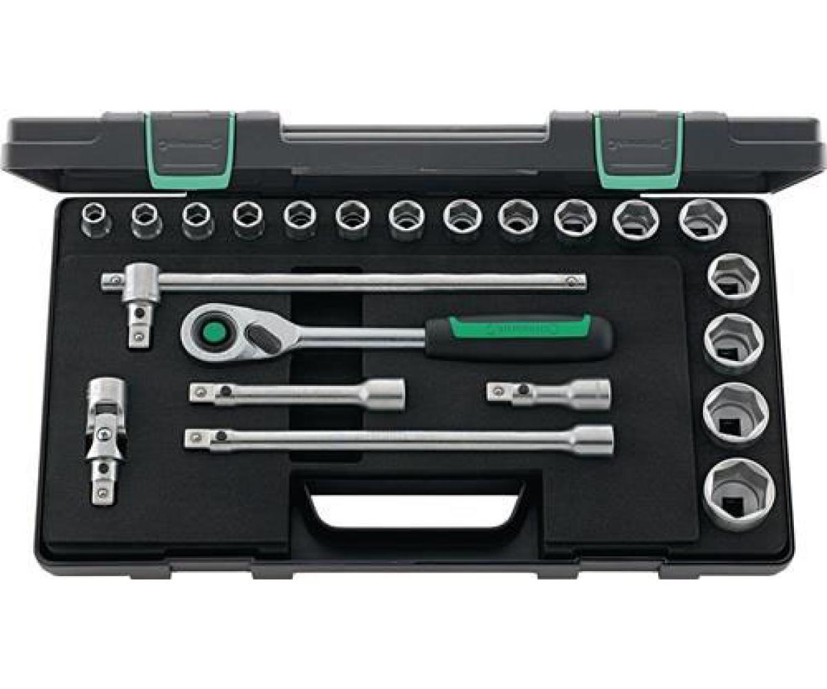 12,5 mm (1/2 ?)-Vierkantantrieb · mit QuickRelease-Sicherheitsverriegelung · Steckschlüssel-Einsätze und Bedienelemente aus Chrom-Alloy-Stahl · verchromt