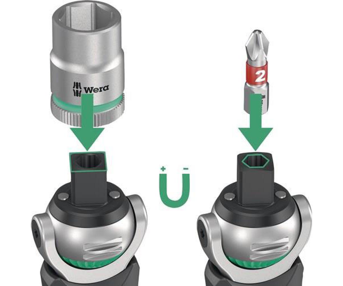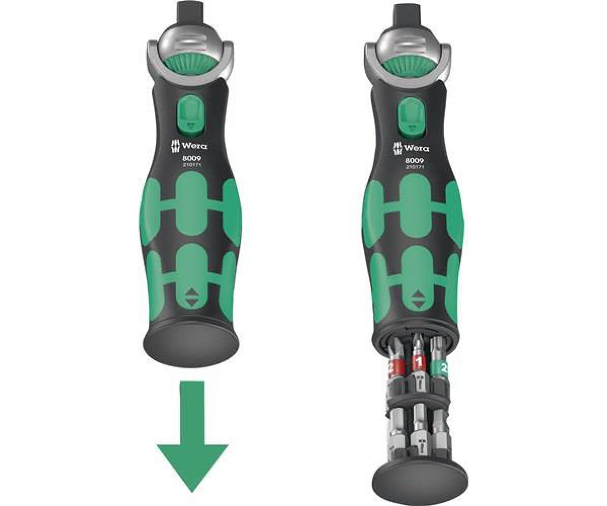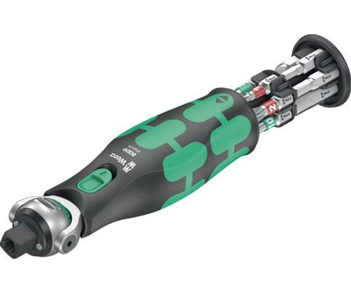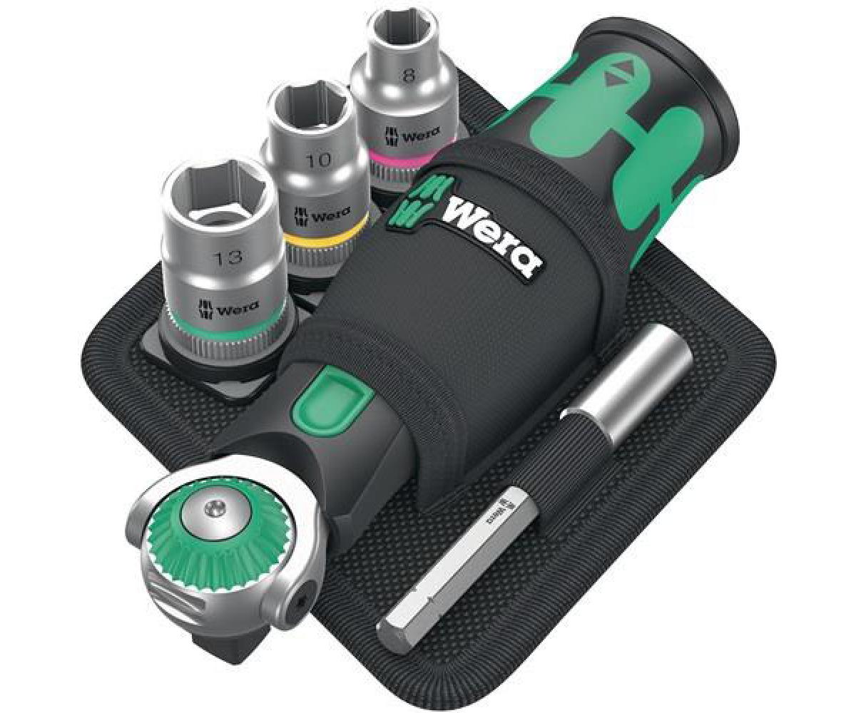 mit Schwenk- und Umschaltknarre 8009 Zyklop · mit Kombiwerkzeugaufnahme geeignet für Steckschlüssel-Einsätze 10,0 mm (3/8?)-Vierkantantrieb und Bits mit 6,3 mm (1/4?)-Sechskantantrieb (C 6,3 und E 6,3) mehrkomponentiger Kraftform-Griff - im Griff · integriertes, unverlierbares, freischwenkbares Magazin mit 12 Bits · frei schwenkbarer Knarrenkopf (definierte Stellung bei 0°, 15° und 90° nach links und rechts) · in 0°-Stellung einsetzbar wie ein konventioneller Schraubendreher · Links-/Rechtsumschaltung · magnetische Direktaufnahme Inhalt: 1 kompakte Zyklop Knarre mit integriertem Bit-Magazin 1 Universalhalter (L. 75 mm - kann als Verlängerung verwendet werden) je 1 Bit mit BiTorsion-Zone für Schrauben mit Kreuzschlitz (PH) Gr. 1 / 2 je 1 Bit mit BiTorsion-Zone für Schrauben mit Kreuzschlitz (PZD) Gr. 1 / 2 je 1 Bit mit BiTorsion-Zone für Schrauben mit Innen-TORX®-Profil Gr. T 10 / 15 / 20 / 25 je 1 Bit mit BiTorsion-Zone für Schrauben mit Innensechskant-Profil Gr. 3 / 4 / 5 / 6 mm je 1 6-kant Steckschlüssel-Einsatz mit 10,0mm (3/8") Vierkantantrieb SW 8 / 10 / 13 mm 1 Halter aus textilem Material (Befestigung am Gürtel möglich) 1 Klettstreifen Gr. 50 x 70 mm
