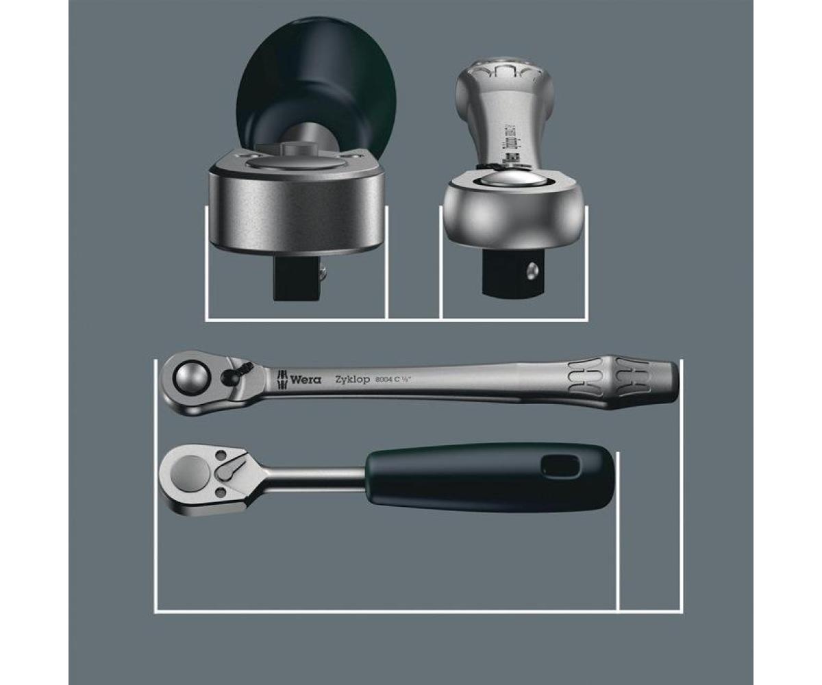 Weitere technische Eigenschaften · Rückschwenkwinkel: 5° · Extra slim: ja · Freilaufhülse: ja · Geeignet für Wera 2go: ja · Gesenkgeschmiedete Vollstahlausführung: ja · Haltefunktion für Aussensechskantschrauben: ja · Nussfixierfunktion: ja · Rückholwinkel 5°: ja · Take it easy Nuss: ja · Twist and Lock: ja · Ultra-Compact: ja · Zyklop Metal Switch: ja · Steckschlüsselsatz 8100 · SB HF 1 · 13-tlg.Innenvierkantant,3 ·