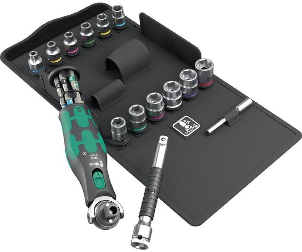 Weitere technische Eigenschaften · BiTorsion: ja · Frei schwenkbarer Knarrenkopf: ja · Freilaufhülse: ja · Geeignet für Wera 2go: ja · Hex-Plus: ja · Kombinationsantrieb: ja · Take it easy Bits: ja · Take it easy Nuss: ja · Steckschlüsselsatz 8009 · Zyklop Pocket Set 3 · 27-tlg.3/8Zoll+1/4 Zoll · Inhalt: 1 kompakte Zyklop Knarre mit integriertem Bit-Magazin je 1 6kant Steckschlüssel-Einsatz 10 mm (3/8")-Vierkantantrieb SW 6 / 7 / 8 / 9 / 10 / 11 / 12 / 13 / 14 / 15 / 16 / 17 mm 1 Zyklop Verlängerung mit Schnelldrehhülse 10 mm (3/8") L. 125 mm 1 Universalhalter für Bits mit Edelstahlhülse und Dauermagnet L. 75 mm je 1 Bit mit BiTorsion-Zone für Schrauben mit Kreuzschlitz (PH) Gr. 1 / 2 je 1 Bit mit BiTorsion-Zone für Schrauben mit Kreuzschlitz (PZD) Gr. 1 / 2 je 1 Bit mit BiTorsion-Zone für Schrauben mit Innen-TORX®-Profil Gr. T 10 / 15 / 20 / 25 je 1 Bit mit BiTorsion-Zone für Schrauben mit Innensechskant-Profil Gr. 3 / 4 / 5 / 6 mm 1 Klettstreifen Gr. 50 x 120 mm ·