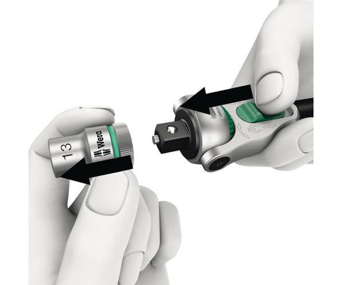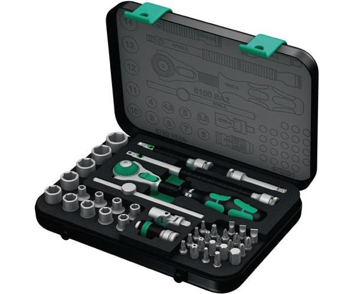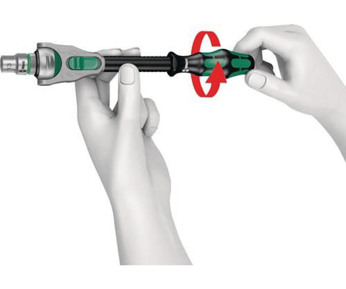 6,3 mm (1/4 ?)-Vierkantantrieb · Steckschlüssel-Einsätze und Bedienungselemente aus legiertem Werkzeugstahl · Steckschlüsseleinsätze matt verchromt · Knarre mit Rechts-Links-Umschaltung in jeder Position · Auswurf des Aufsteckwerkzeugs durch Knopfdruck oder Schiebeschalter in jeder Position Besondere Produktvorteile der Knarre: - Schwungmassenkonstruktion - griffige Schnelldrehhülse - schwenkbarer Knarrenkopf (definierte Stellungen bei 0°, 15° und 90°) Inhalt: 1 Schwenk- und Umschaltknarre (72 Zähne) mit Schwungmassenkonstruktion und Schnelldrehhülse je 1 6-kant-Steckschlüsseleinsatz SW 4 / 4,5 / 5 / 5,5 / 6 / 7 / 8 / 9 / 10 / 11 / 12 / 13 / 14 mm je 1 Verlängerung mit Schnelldrehhülse und Flexible-Lock-System 75 / 150 mm 1 Wobble-Verlängerung 56 mm mit Ausschwenkwinkel von 15° 1 Quergriff mit Gleitstück 1 Kardangelenk 1 Adapter mit Schnellwechselfutter 6,3 mm (1/4")-Außenvierkant auf 6,3 mm (1/4 ?)-Außensechskant zum maschinellen Antrieb (konventioneller Akkuschrauber) von Steckschlüssel-Einsätzen je 1 Bit für Schlitzschrauben Gr. 4,5 x 0,6 / 5,5 x 1,0 / 8,0 x 1,2 mm* je 1 Bit für Schrauben mit Innensechskant-Profil Gr. 3 / 4 / 5 / 6 / 8 mm* je 1 Bit für Schrauben mit Kreuzschlitz (PH) Gr. 1 / 2 / 3* je 1 Bit für Schrauben mit Kreuzschlitz (PZD) Gr. 1 / 2 / 3* je 1 Bit mit Bohrung für Schrauben mit Innen-TORX®-Profil mit Sicherungsstift Gr. T 8 / 9 / 10 / 15 / 20 / 25 / 27 / 30 / 40* * Bitlänge jeweils 25 mm