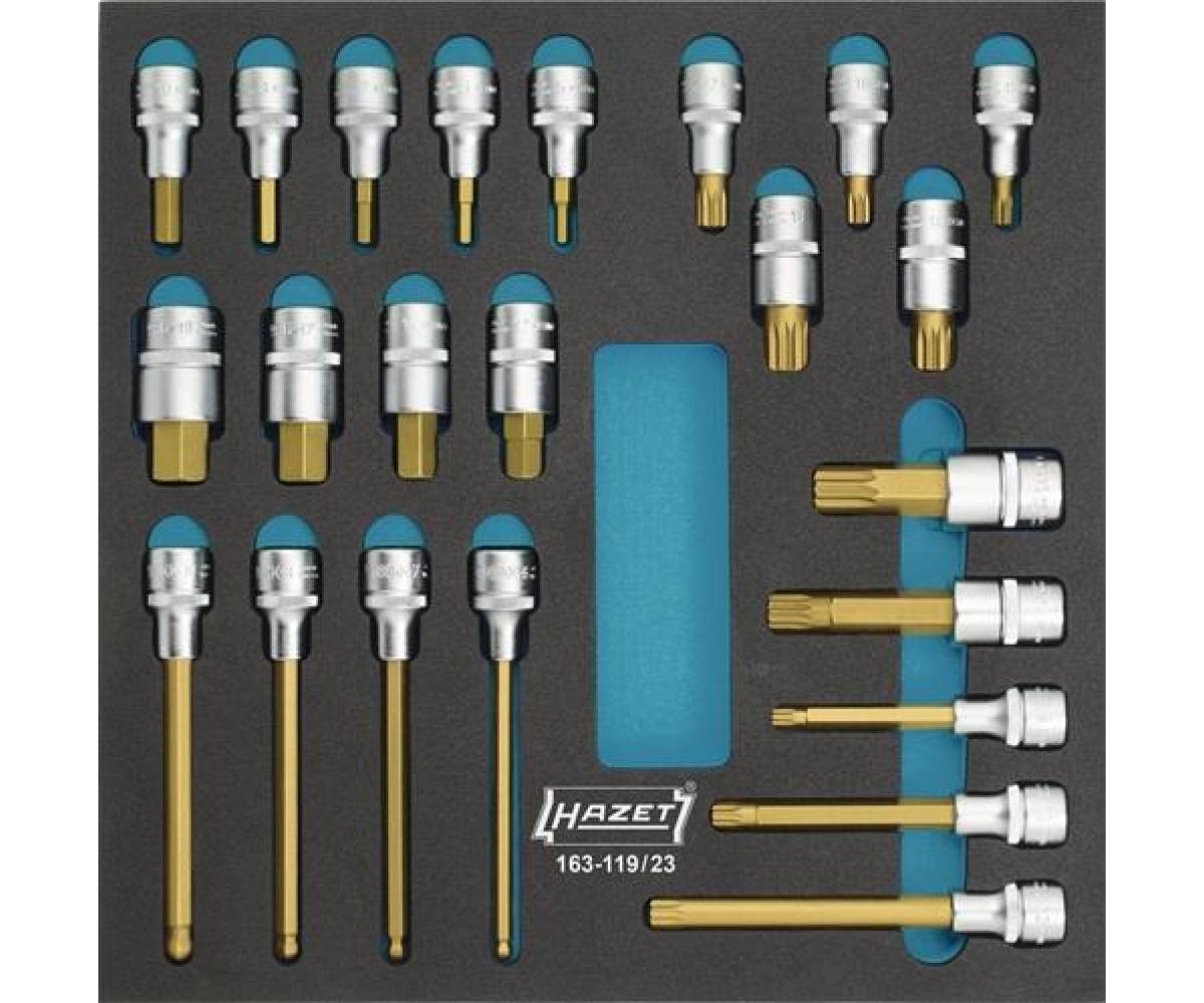 Weitere technische Eigenschaften · Breite: 344mm · Tiefe: 342mm · Werkzeugmodul 163-119/23 · 23-tlg.HAZET · je 1 Schraubendreher-Steckschlüsseleinsatz 12,5 mm (1/2?) für Innensechskant-Schrauben 5 / 6 / 7 / 8 / 10 / 12 / 14 / 17 / 19 mm je 1 Schraubendreher-Steckschlüsseleinsatz 12,5 mm (1/2?) für Innensechskant-Schrauben ( mit Kugelkopf, lange Ausführung) 6 / 7 / 8 / 10 je 1 Schraubendreher-Steckschlüsseleinsatz 12,5 mm (1/2?) für Innen-Vielzahn Profil (XZN) M 8 / 10 / 12 / 14 / 16 / 18 je 1 Schraubendreher-Steckschlüsseleinsatz 12,5 mm (1/2?) für Innen-Vielzahn Profil (XZN) lange Ausführung M 8 / 14 je 1 Schraubendreher-Steckschlüsseleinsatz 12,5 mm (1/2?) für Innen-Vielzahn Profil (XZN) extra lange Ausführung M 10 / 12 ·