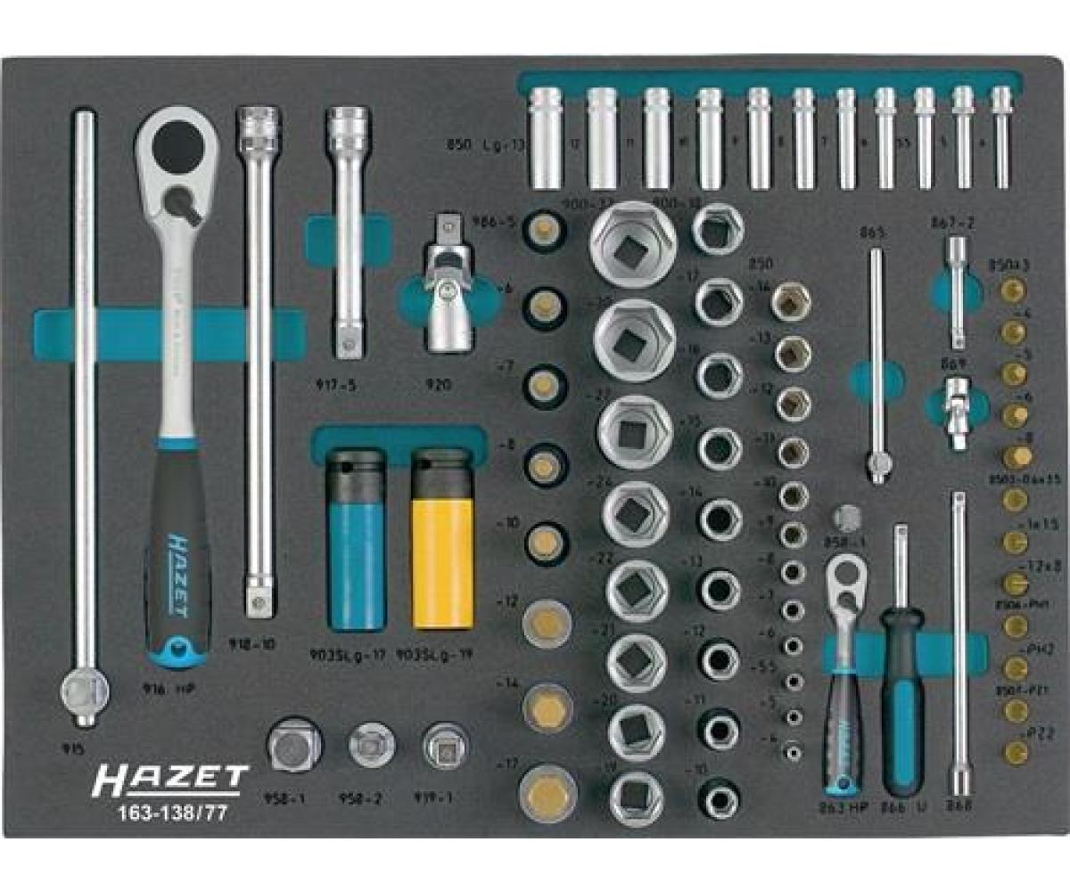 Weitere technische Eigenschaften · Breite: 519mm · Tiefe: 392mm · Werkzeugmodul 163-138/77 · 77-tlg.HAZET · 6,3 mm (1/4?) je 1 Steckschlüssel-Einsatz für Außensechskant-Schrauben SW 4 / 5 / 5,5 / 6 / 7 / 8 / 9 / 10 / 11 / 12 / 13 / 14 je 1 6-kant Steckschlüssel-Einsatz lange Ausführung SW 4 / 5 / 5,5 / 6 / 7 / 8 / 9 / 10 / 11 / 12 / 13 je 1 Schraubendreher-Steckschlüsseleinsatz für Innensechskant-Schrauben 3 / 4 / 5 / 6 / 8 je 1 Schraubendreher-Steckschlüsseleinsatz für Schlitzschrauben 0,6 X 3,5 / 1,0 X 5,5 / 1,2 X 8,0 je 1 Schraubendreher-Steckschlüsseleinsatz für Kreuzschlitz-Schrauben (PH) 1 / 2 je 1 Schraubendreher-Steckschlüsseleinsatz für Pozidriv-Schrauben (PZ) 1 / 2 1 Quergriff L: 115 mm je 1 Verlängerung L: 55 / 147 mm 1 Kardangelenk L: 36,5 mm 1 Umschaltknarre L: 115 mm 1 Steckgriff L: 134 mm 1 Vergrößerungsstück auf 10 mm (3/8?) Innenvierkant 12,5 mm (1/2?) je 1 Steckschlüssel-Einsatz für Außensechskant-Schrauben SW 10 / 11 / 12 / 13 / 14 / 15 / 16 / 17 / 18 / 19 / 20 / 21 / 22 / 24 / 27 / 30 / 32 je 1 Schraubendreher-Steckschlüsseleinsatz für Innensechskant-Schrauben SW 5 / 6 / 7 / 8 / 10 / 12 / 14 / 17 je 1 Kraft- Steckschlüssel-Einsatz für Außensechskant-Schrauben mit Kunststoff-Einsatz und drehbarer Kunststoff-Hülse außen SW 17 / 19 1 Quergriff L: 298 mm 1 Kardangelenk L: 70 mm je 1 Verlängerung L: 123 / 248 mm 1 Feinzahn-Umschaltknarre L: 275 mm 1 Vergrößerungsstück auf 20 mm (3/4?) Innenvierkant 1 Reduzierstück auf 10 mm (3/8?) Innenvierkant 1 Schwenkbare Verlängerung L: 46 mm ·