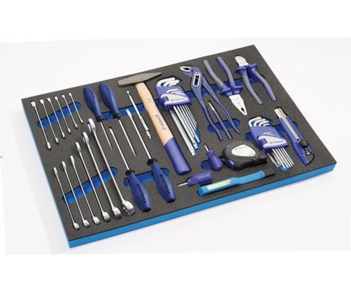 Inhalt: 1 Ring-Maul-Schlüssel-Satz 12-teilig 6 - 22 mm 1 Wasserpumpenzange 240 mm 1 Kombizange 180 mm 1 Seitenschneider 160 mm 1 Schlosserhammer 300 g mit Hickorystiel Stiel 1 Cuttermesser 1 Taschenrollbandmaß 5 m 1 Teleskopmagnetheber mit Düseneinstellnadel 150 - 670 mm 1 Körner 120 mm 1 LED-Taschenlampe 1 Winkelschraubendreher-Satz für Schrauben mit Innen-TORX®-Profil, 8-teilig, SW 9 - 40 1 Winkelschraubendreher-Satz 6-kant, 9-teilig, SW 1,5 - 10 mm 2 Schraubendreher für Schlitzschrauben 5,5 x 125 / 6,5 x 150 mm 2 Schraubendreher für Schrauben mit Kreuzschlitz (PH) Gr.1 x 80 / 2 x 100 mm 1 Schraubendreher für Schrauben mit Kreuzschlitz (PH) Gr. 2 x 25 mm 1 Schraubendreher für Schrauben mit Kreuzschlitz (PZD) Gr. 2 x 25 mm Werkzeuge in hochwertiger Einlage aus Schaumstoff