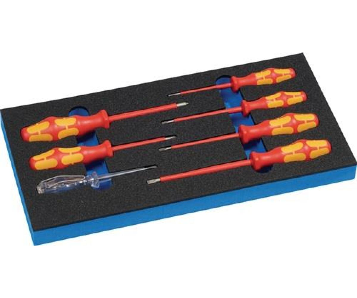 (1/3 Modul) Schraubendrehersatz VDE isoliert + Rack + Spannungsprüfer · mit ergonomischen Mehrkomponenten-Kraftform-Griffen mit Abrollschutz · mit harten Griffzonen für hohe Arbeitsgeschwindigkeit und weichen Griffzonen für hohe Drehmomentübertragung · gefertigt gem. IEC 60900 · stückgeprüft bei 10000 Volt im Wasserbad · Klingen aus hochlegiertem Molybdän-Vanadium-Stahl · mit Lasertip-Spitze · unverlierbares Größenleitsystem an den Griffenden als zeitsparende Erkennungshilfe für die jeweilige Schraubenart · Klingen durchgehend gehärtet · isoliert