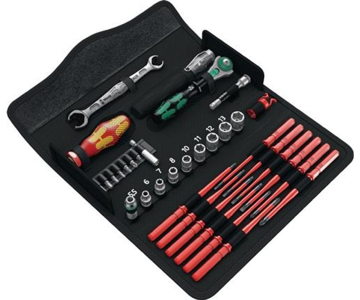 Wartung mit den 35 wichtigsten Schraubwerkzeugen für Wartungsarbeiten im Innen- und Außenbereich Inhalt: 1 Kraftform Handhalter VDE-isoliert 1 Wechselklinge für Schlitzschrauben 2,5 mm, VDE isoliert* je 1 Wechselklinge für Schlitzschrauben 3,5 / 4,0 / 5,5 mm, VDE isoliert** je 1 Wechselklinge für Schrauben mit Kreuzschlitz (PH) Gr. 1 / 2, VDE isoliert** je 1 Wechselklinge für Schrauben mit Kreuzschlitz (PZD) Gr. 1 / 2, VDE isoliert** 1 Wechselklinge für Schrauben mit Innen-TORX®-Profil Gr. T 10, VDE isoliert* je 1 Wechselklinge für Schrauben mit Innen-TORX®-Profil Gr. T 15 / 20 / 25, VDE isoliert* 1 aufsteckbarer Schraubenhalter 1 einpoliger Spannungsprüfer (150 - 250 Volt AC) 1 Doppel-Maulschlüssel SW 10 x 13 ?Joker? mit Haltefunktion 1 Schwenk-/Umschaltknarre Zyklop speed 6,3 mm (1/4?) 1 Verbindungsteil 6,3 mm (1/4?)-Innenvierkant auf 6,3 mm (1/4?)-Innensechskant (zum Antrieb von Bits (konventioneller Akkuschrauber)) 1 Verlängerung 6,3 mm (1/4?) mit Schnelldrehhülse 75 mm je 1 6-kant Steckschlüssel-Einsatz 6,3 mm (1/4?) SW 5,5 / 6 / 7 / 8 / 10 / 11 / 12 / 13 mm 1 Bit-Universalhalter mit Edelstahlhülse und starkem Dauermagnet 50 mm lang je 1 Bit für Schrauben mit Kreuzschlitz (PZD) Gr. 1 / 2*** je 1 Bit für Schrauben mit Innensechskant-Profil Gr. 3 / 4 / 5 / 6 mm*** 1 Bit für Schrauben mit Innen-TORX®-Profil Gr. T 25*** * 154 mm lang, **154 mm lang mit reduziertem Klingendurchmesser, ***25 mm lang