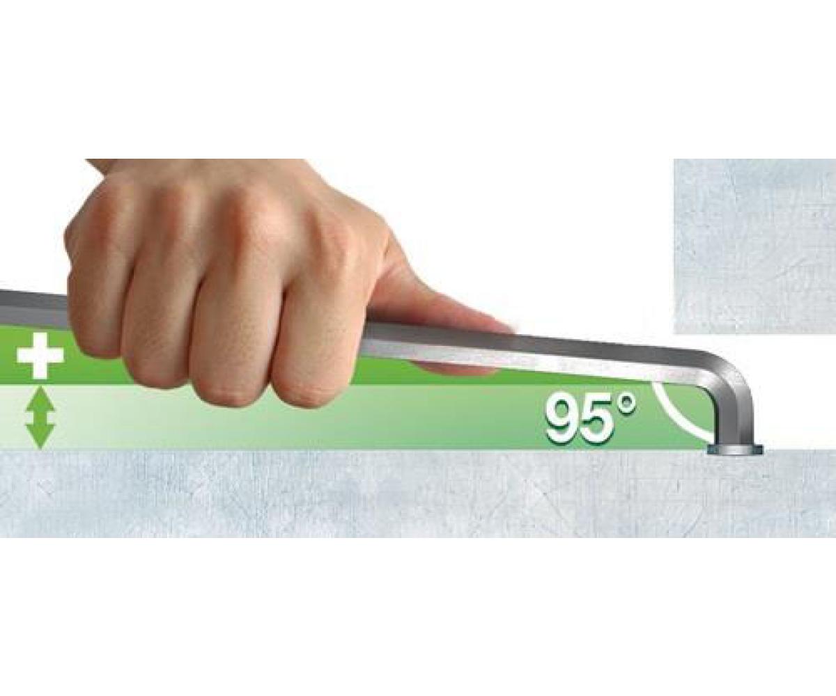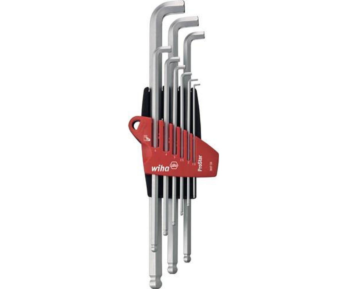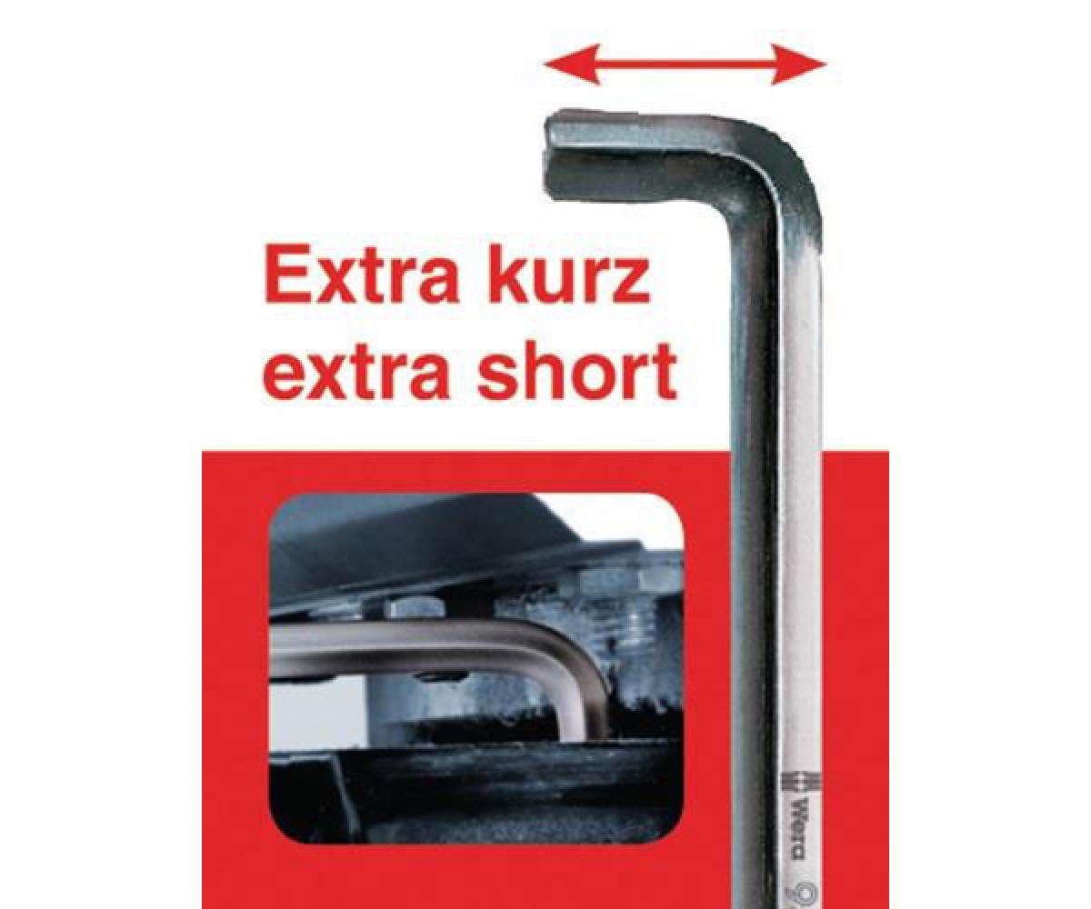 mit Kugelköpfen · lang · legierter Werkzeugstahl · matt verchromt · langer Schenkel mit Kugelkopf ermöglicht das Schrauben bis zu einem Winkel von 25° · kurzer Schenkel gefast, extra-kurz für Arbeiten in besonders engen Räumen die 95°-Biegung des Schlüssels liefert ein optimales Verhältnis für platzsparendes Verschrauben bis zu doppeltem Arbeitsraum und schützt vor Verletzungen der Fingerknöchel der deutlich schlankere Biegeradius als bei einem Standard-Schlüssel sorgt für ein komplettes Eintauchen des Stubby in den Schraubenkopf Bestückung: je 1 Stück 1,5 x 91/5,5 mm 2,0 x 101/9,0 mm 2,5 x 113/9,5 mm 3,0 x 128/11,0 mm 4,0 x 142/13,0 mm 5,0 x 163/15,0 mm 6,0 x 184/18,0 mm 8,0 x 206/22,0 mm 10,0x231/28,0 mm