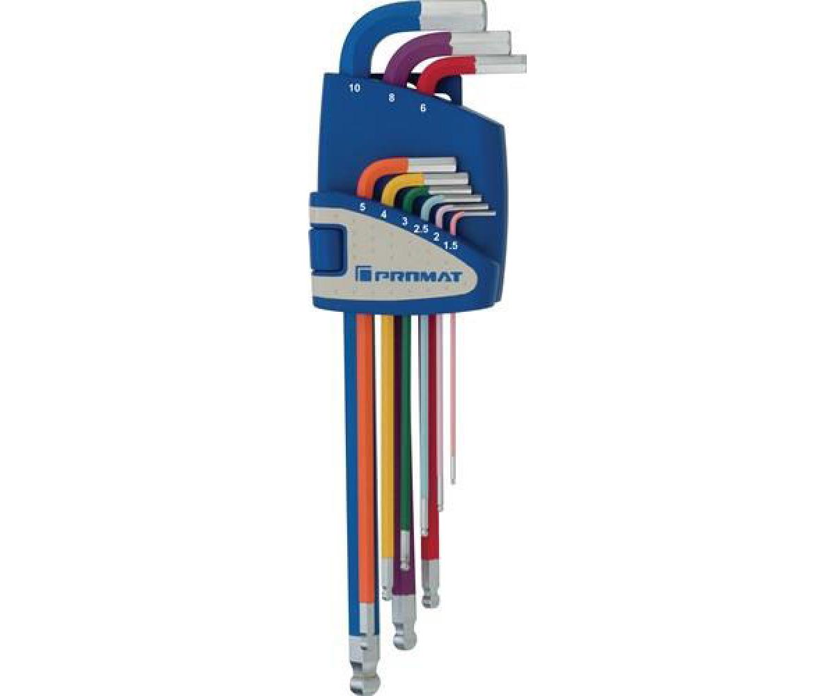 mit Kugelköpfen · lang · mit Farbcodierung S2-Stahl · pulverbeschichtet · mattverchromt · abgewinkelt · langer Schenkel mit Kugelkopf · ermöglicht das Schrauben bis zu einem Winkel von 25° · kurzer Schenkel gefast Besondere Produktvorteile: jeder Schlüssel für schnelles Finden farbcodiert