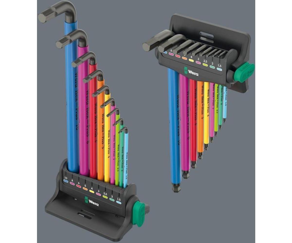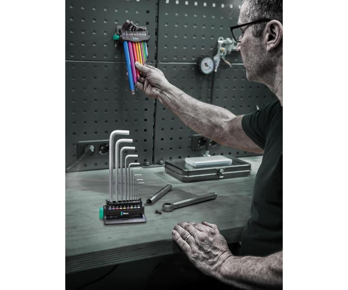 9 Winkelschlüssel mit Kunststoffummantelung (SPKL) aus grifffreundlichem Rundmaterial - die Ummantelung macht die Arbeit auch bei niedrigen Temperaturen angenehm und schont die Finger · alle Winkelschlüssel sind durch ihre Farbcodierung und Größenkennzeichnung schnell zur Hand · praktische Aufbewahrung im Rack 9109 zum Hinstellen auf den Tisch oder zur Befestigung an der Wand · im Rack integrierter Clip 9539, der für für den mobilen Einsatz entnommen werden kann - das Rack enthält obendrein einen cleveren abnehmbaren Magnetisierer 9538, mit dem Schrauben und auch Werkzeugspitzen magnetisiert (und entmagnetisiert) werden können, so muss die Schraube nicht mehr mühsam mit der zweiten Hand festgehalten werden