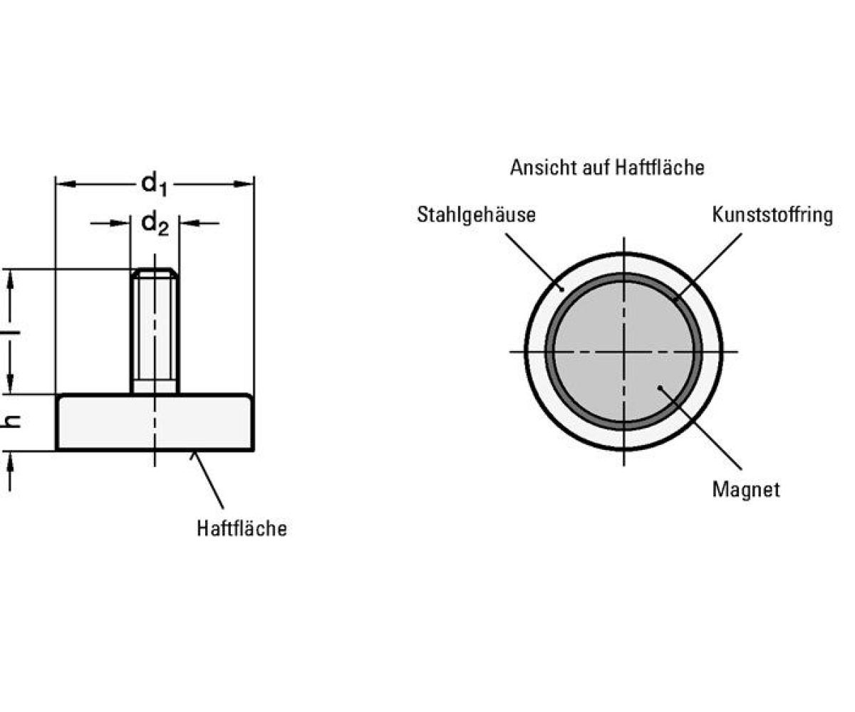 Weitere technische Eigenschaften · d1: 63 - 3mm · d2: M 6mm · l: 15mm · h: 14 - 5mm · Haltemagnet GN 50.3 d1 · 63-3mm d2 M 6mm · Hartferrit HF GANTER ·