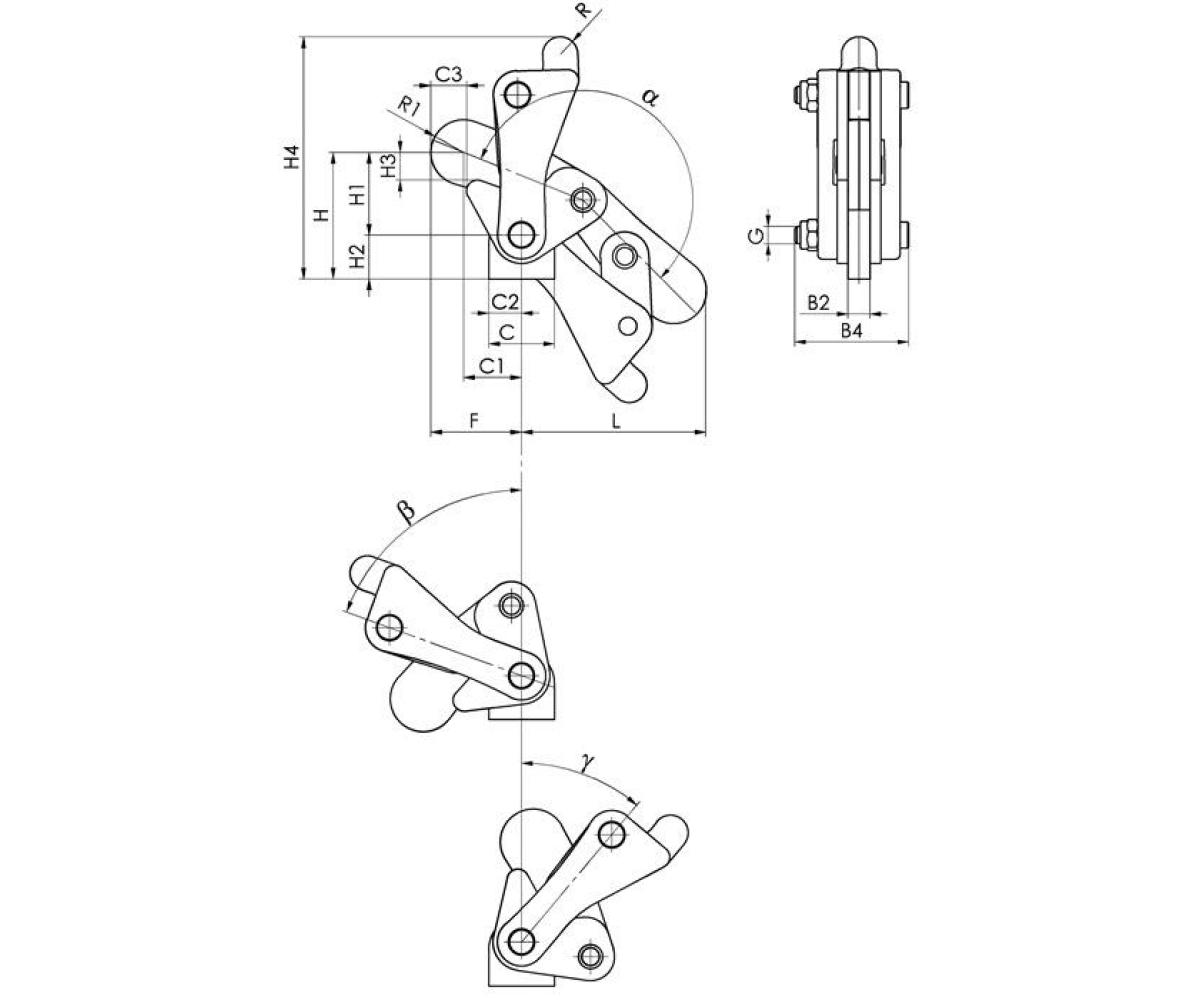 Weitere technische Eigenschaften · C: 22mm · H4: 76mm · B2: 6mm · C3: 12mm · a: 200° · R1: 10mm · G: M6 · H1: 18mm · b: 70° · F1: 2,5kN · H2: 20mm · L: 58mm · B4: 31mm · F: 32mm · R: 5mm · C1: 22mm · H: 38mm · H3: 5mm · C2: 11mm · g: 40° · Modulspanner Nr.6809P · Gr.2 m.Schwenkfuß · schweißbar AMF ·