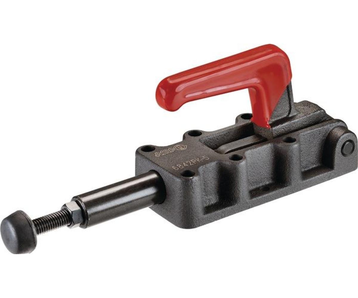 schwer · mit massivem Handhebel · Druck- und Zugspanner · (Schubstange und Handhebel gleichlaufend) · mit langer Schubstangenführung · Grundkörper aus Temperguss, brüniert · gehärtete Bolzen · Hebelteile und Schubstange aus Vergütungsstahl, brüniert · Handgriff aus rotem, ölbeständigem Kunststoff · komplett mit vergüteter, verzinkter Andrückschraube