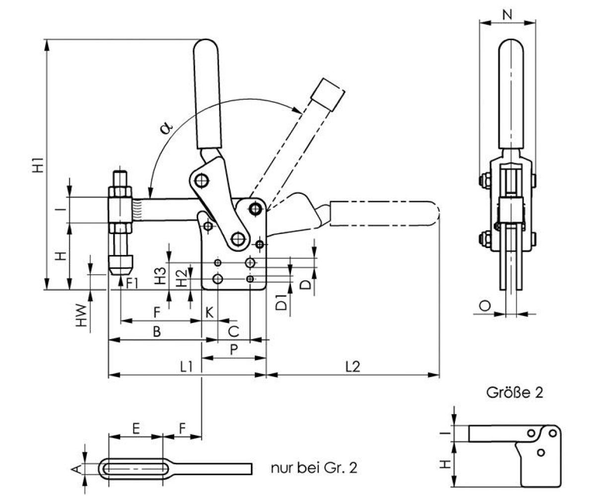Weitere technische Eigenschaften · A: 12,2mm · C: 30mm · D: 8,5mm · L2: 161mm · HW min.: -1mm · L1: 146mm · HW max.: 35mm · H1: 233mm · F1: 10kN · H2: 10mm · O: 10mm · Bohrungs-Ø: 8,5 mm · a*: 120° · I: 24mm · F: 75mm · B: 101mm · P: 60mm · Eigenschaft: schwer · K: 15mm · H: 62mm · H3: 25mm · N: 52mm · D1: 5,7mm · Spannweite: · Senkrechtspanner Nr.6812P · Gr.4 senkrechter Fuß · schwer AMF ·