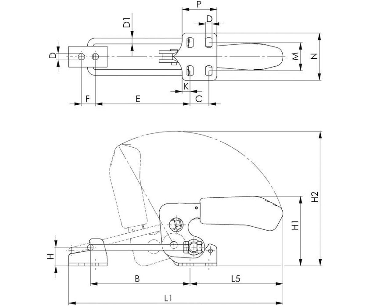 Weitere technische Eigenschaften · L5: 69mm · C: 13mm · D: 5,2mm · E max.: 72mm · L1 min.: 125mm · L1 max.: 159mm · E min.: 38mm · H1: 47mm · H2: 99mm · Armlänge: 69mm · B max.: 76mm · Bohrungs-Ø: 5,2mm · F: 11mm · B min.: 42mm · P: 26mm · K: 6,4mm · M: 19,5-23,5mm · H: 12mm · N: 38mm · D1: 4mm · Verschlussspanner · Nr.6848HNI Gr.2 horiz.AMF ·