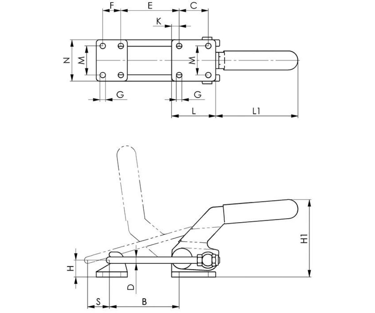 Weitere technische Eigenschaften · S: 44mm · C: 45mm · D: 10mm · G: 8,5mm · L1: 130mm · H1: 122mm · Armlänge: 130 mm · L: 68mm · Bohrungs-Ø: 8,5mm · F: 28mm · B: 42-107mm · Eigenschaft: schwer · K: 12mm · E: 24-90mm · M: 45mm · H: 26mm · N: 64mm · Verschlussspanner · Nr.6849PH Gr.4 · horiz.schwer AMF ·